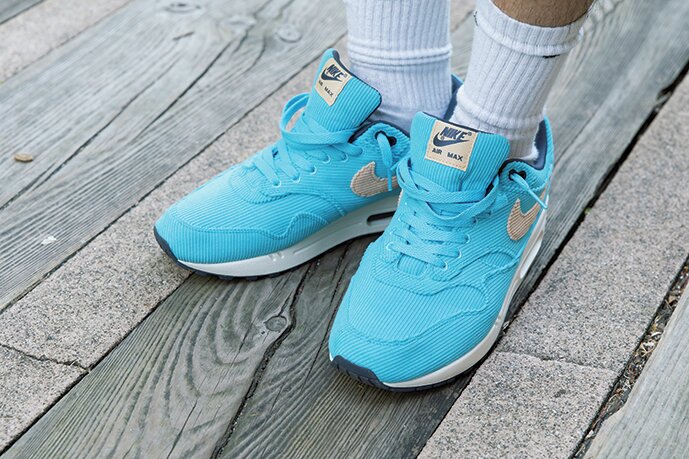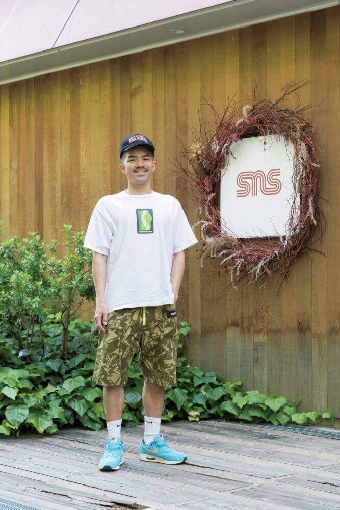 スウェーデン発の人気セレクトショップであるSNSの名物スタッフである押田さんは、イギリスのアリーズのミリタリーショーツでこなれた印象に。足元には先日リリースされたコーデュロイのエアマックス1で、アクセントを付けている。Tシャツは、SNSのオリジナルブランド。