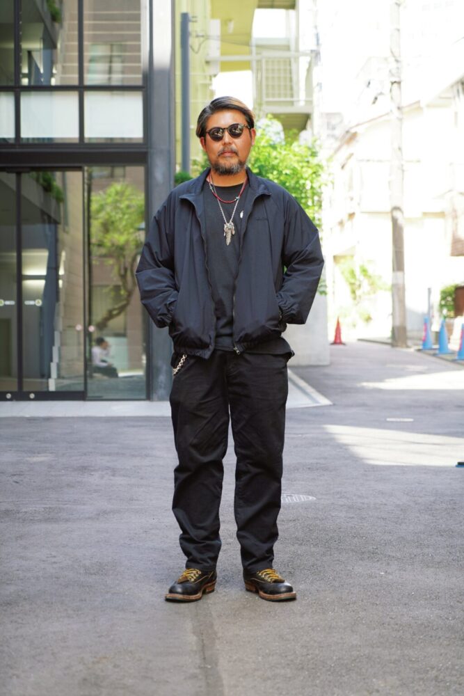 トロフィークロージングの2号店となるトロフィージェネラルストア金沢の代表を務める工保さんは、オールブラックの無骨なミリタリーコーデ。トップスは、USアーミーのトレーニングジャケットをモチーフとしたデザインなので、ほどよくカジュアル感があるのもポイントだ。