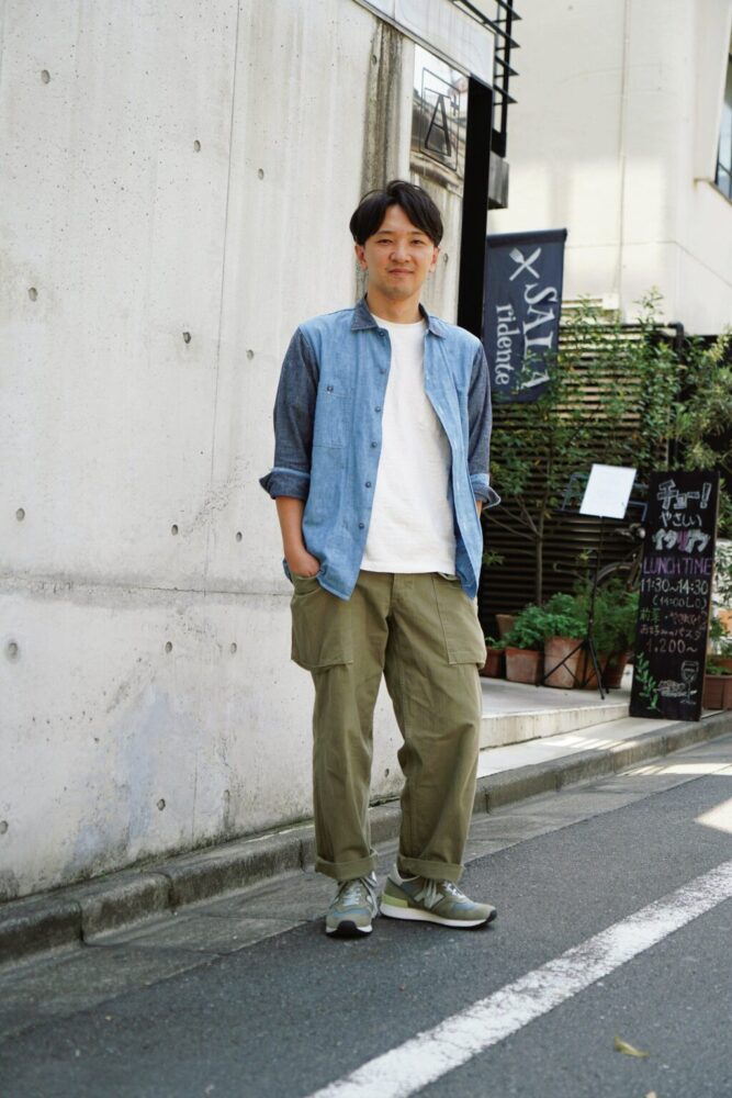ヴィンテージスウェットのコレクターとしても有名な名物スタッフの浅井さんは、ウエアハウスのカーゴパンツに、シャンブレーシャツというミリタリー×ワークの組み合わせがポイント。ツートーンのデザインや足元のニューバランスなど、無骨すぎないように工夫している。