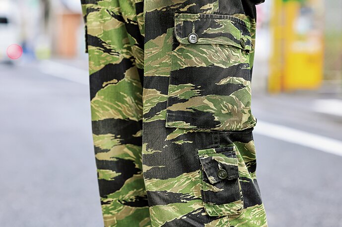 1950年代のポプリンユーティリティシャツに銘品とされるタイガーストライプをコーディネイト。「ミリタリーのセットアップですが、インナーにポップなプリントのTシャツを挿し込み、スニーカを合わせることで軽快さを演出しました」