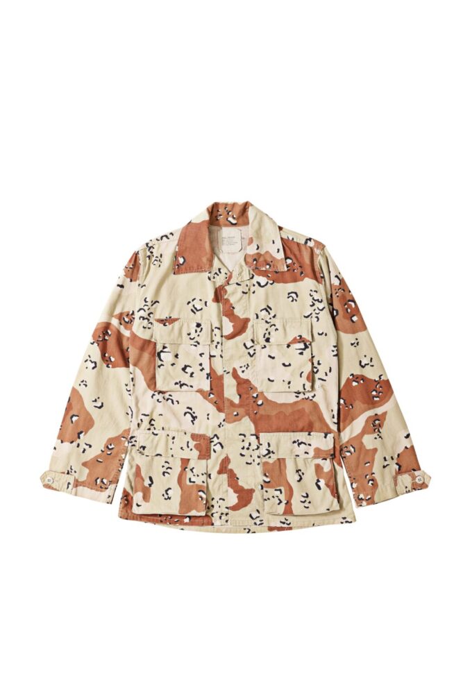 1980年代の米陸軍BDUジャケットの実物。控えめなチョコチップカモがストリートで映えること間違いなし。SMALLXX SHORTというレアなサイズだから小柄な日本人でもスマートに着こなせる。8580円(ベルベルジン TEL03-3401-4666)