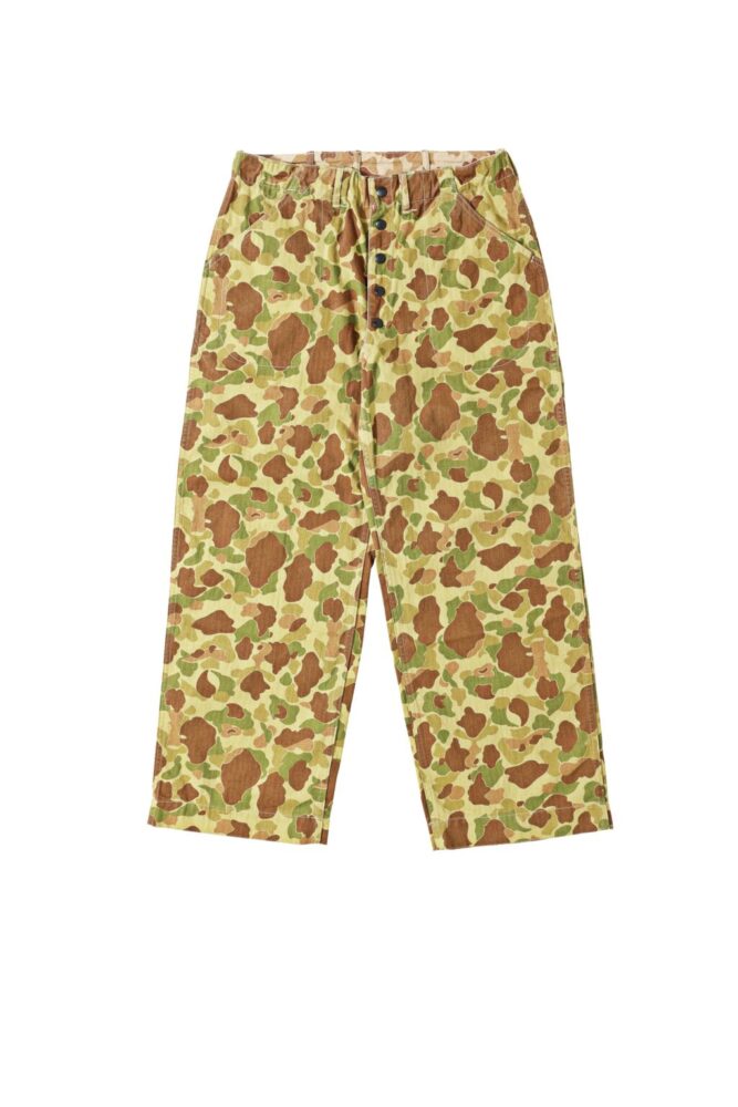 実存数が極めて少ないと言われる米海兵隊の空挺部隊、通称「パラマリン」のパンツ。ヘリンボーン生地の両面に顔料でマリンコープのカモ柄をプリントしており、色が重なる箇所に独特の滲みが出る。3万6850円(ウエアハウス東京店 TEL03-5457-7899)