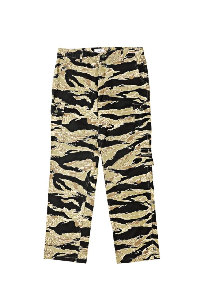 ベトナム戦争で使用されたゴールドタイガーストライプトラウザー。やや細身で股上も浅めなのでスッキリと穿きやすい。ちなみに初期はプリント技術と生産性の高さから日本で生地を調達していたという。2万5300円(東洋エンタープライズTEL03-3632-2321)
