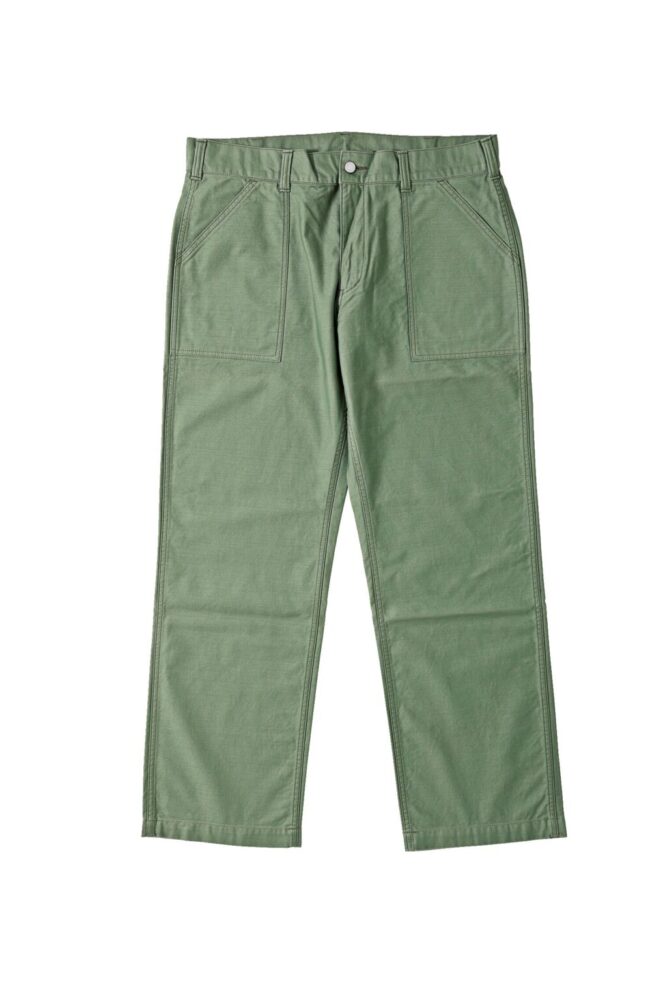 ミリタリーウエアとしても使用されたベイカーパンツをカーキ色のバックサテンで。ゆったりとした太めのシルエットに外側に縫い付けられたポケットが特徴的な児島ジーンズワークウエアのエントリーモデル。1万3200円(児島ジーンズ 児島店 TEL086-476-5566)