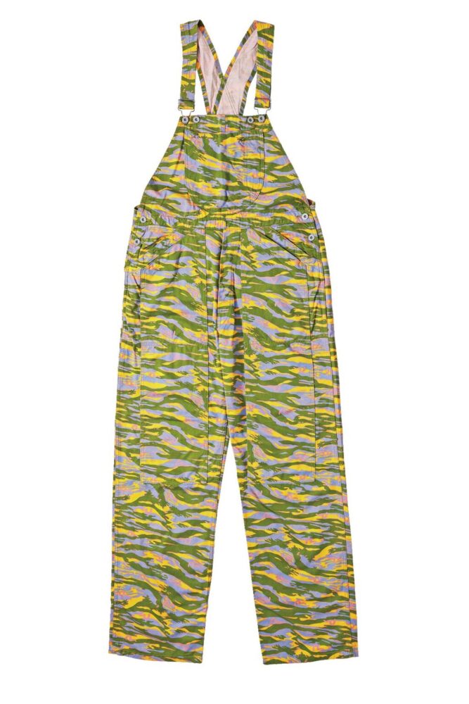 斬新なカラーリングが目を引くタイガーカモ柄のオーバーオール。カモ柄の中にエヴィスのトレードマークカモメが散りばめられる。ポケットも多く使い勝手も抜群。2 万6400 円(EVIS THETOKYO TEL03-3710-1999)