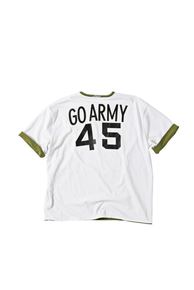 アメカジをベースに遊び心あふれるアイテムを手がけるジャクソンマティスの新作Tシャツはアーミーをテーマにした1枚。アーミーカラーのオリーブとホワイトのリバーシブル仕様。1万8700円(ハンドイントゥリーショールームTEL03-3796-0996)