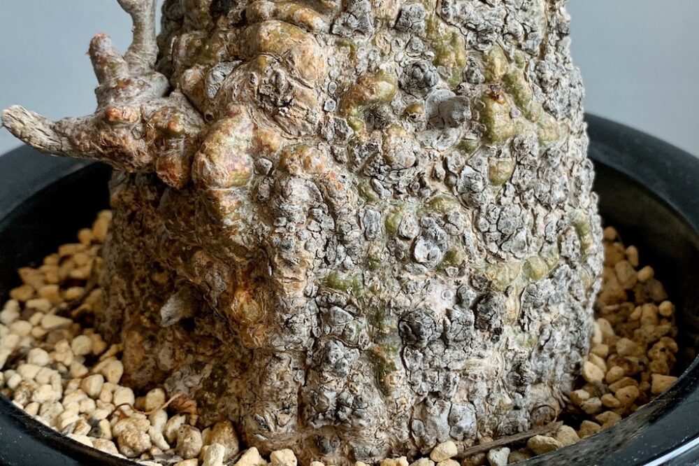 ゴツゴツした凹凸のある表皮と株元に近づくほど太くなる塊根は、まさに象の足のようなずんぐりとした姿をしています。