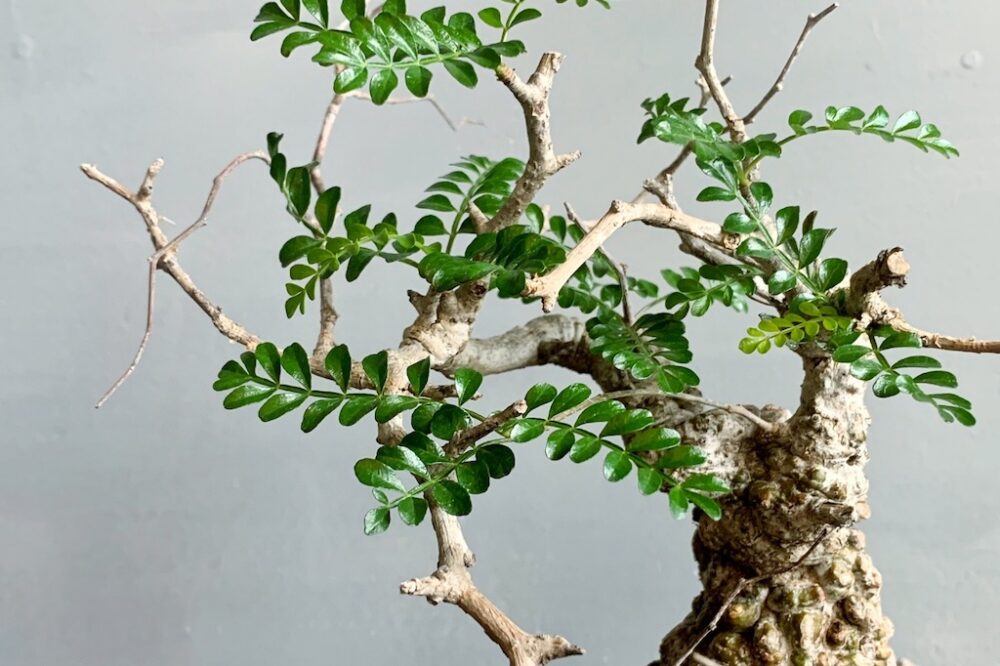 ずんぐりと太い塊根に対して、枝は意外と細くジグザグと曲がりながら伸びているのが特長です。また、生育期にはその枝から羽状複葉の丸く小さい葉を展開します。