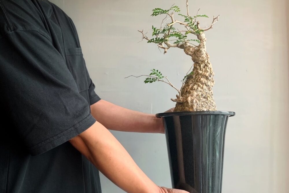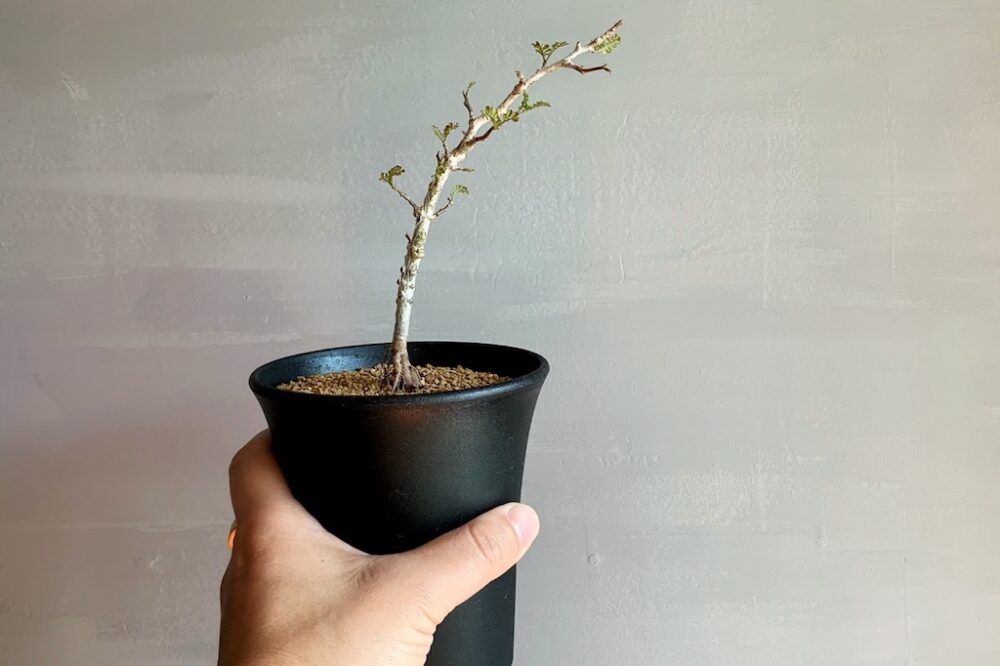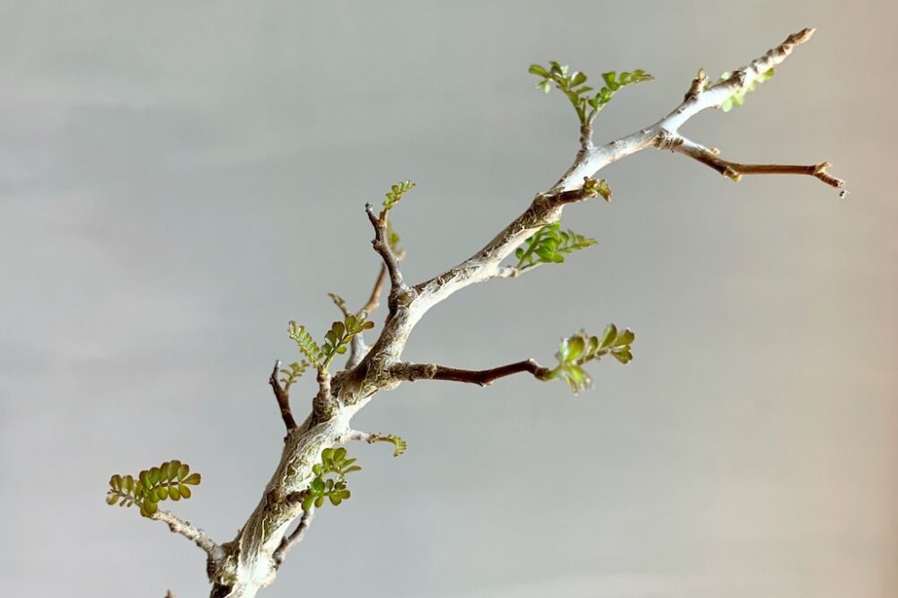 幹の凹凸感に加え、ジグザグとした枝やパキプスの特徴的な羽状複葉が確認できます。まだ芽吹き始めたばかりなので葉は少ないですが、ここから夏に向けて枝を伸ばしながらさらに葉を増やしていきます。
