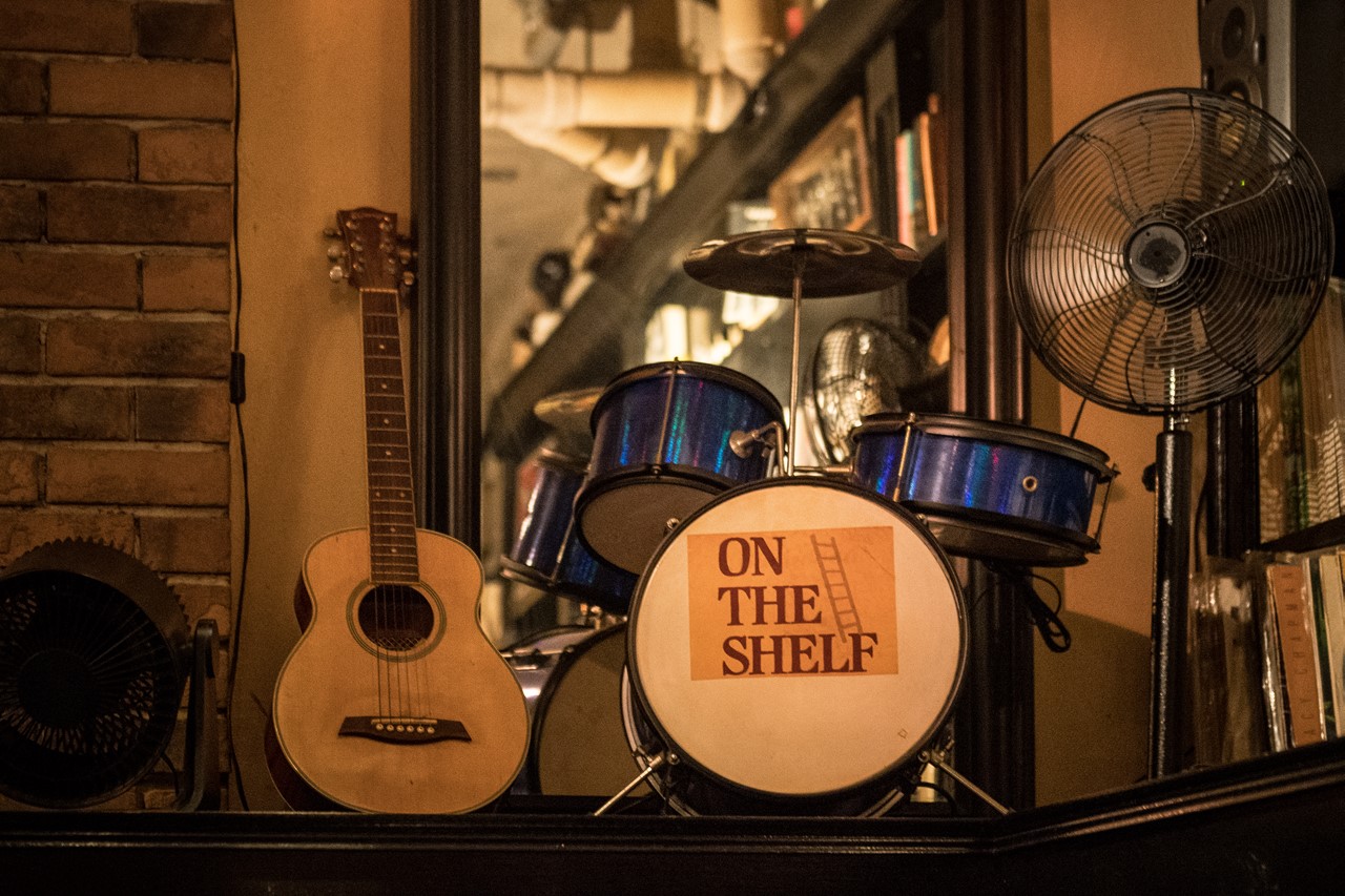 ギターやドラムセットも店のインテリアの一部。置かれた場所とON THE SHELFの文字によるユーモアあふれるギミックも面白い。