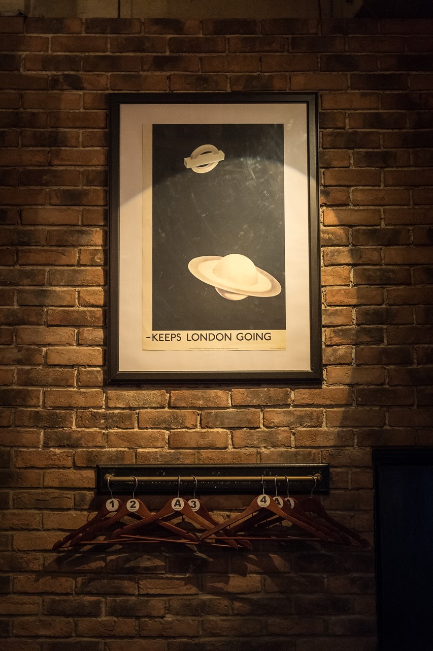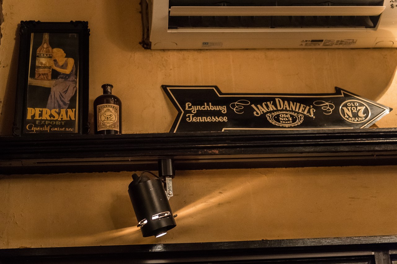 また’30年代のフランスリキュールのPER SAN EXPORTのポスターやジャックダニエルのオブジェ、MONKEY 47のビンも無造作にレイアウトされている。