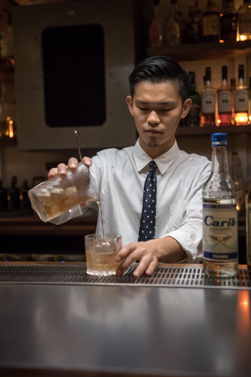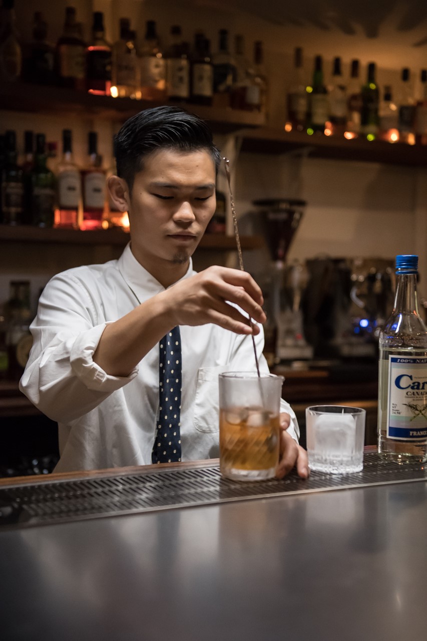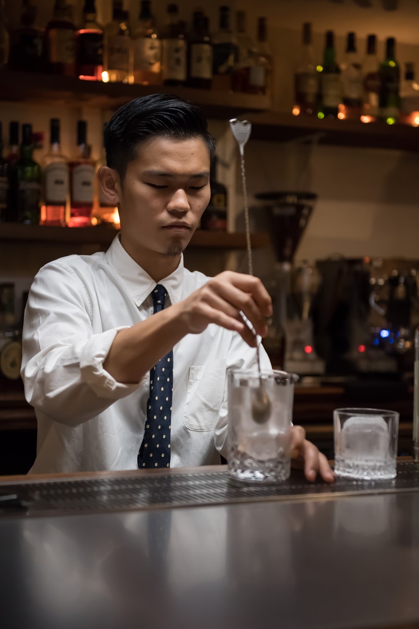 4.全て入った材料をミキシンググラスの中でステアして、全てを冷やしながら混ぜ合わせる。