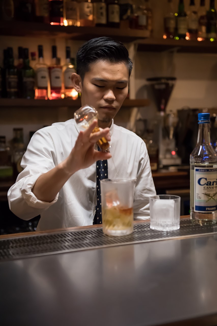 3.シンプルシロップを入れて、オレンジビターズとアンゴスチュラ・ビターズを入れる。