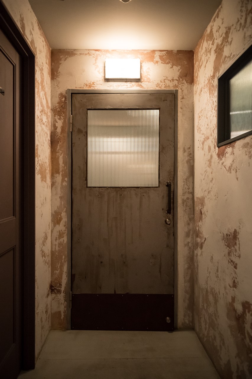 地下にある店内の入り口。エイジングされたヴィンテージ感のある佇まいが、上質空間への期待を抱かせてくれる。