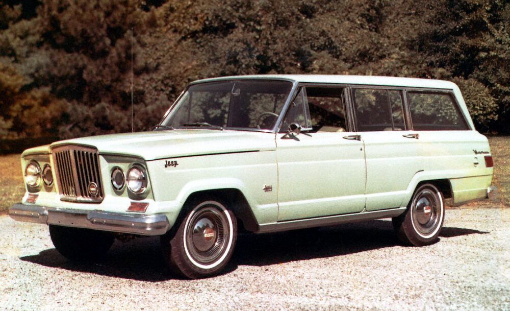 ボディデザインはブルックス・スティーブンス。初代は丸目2灯(グリルの左右にあるのはライトではなく飾り)で幅の狭いフロントグリルだった。1966年にはAMCのV8エンジンを搭載し、エアコンなどを標準装備、さらにはセパレートシートのフロアシフト(通常はベンチシートでコラムシフトだった)を採用したスーパーワゴニアが誕生する。このモデルはラグジュアリーSUVの先駆けだった。