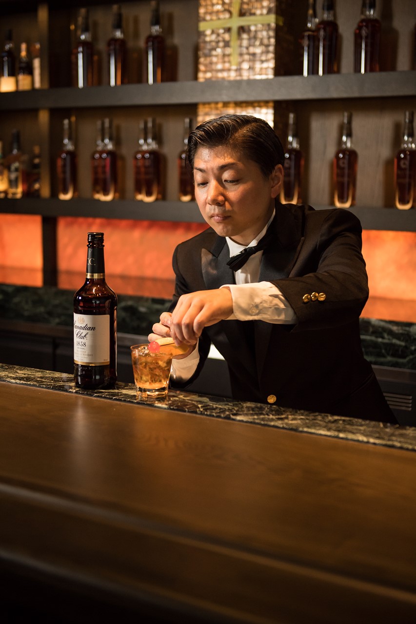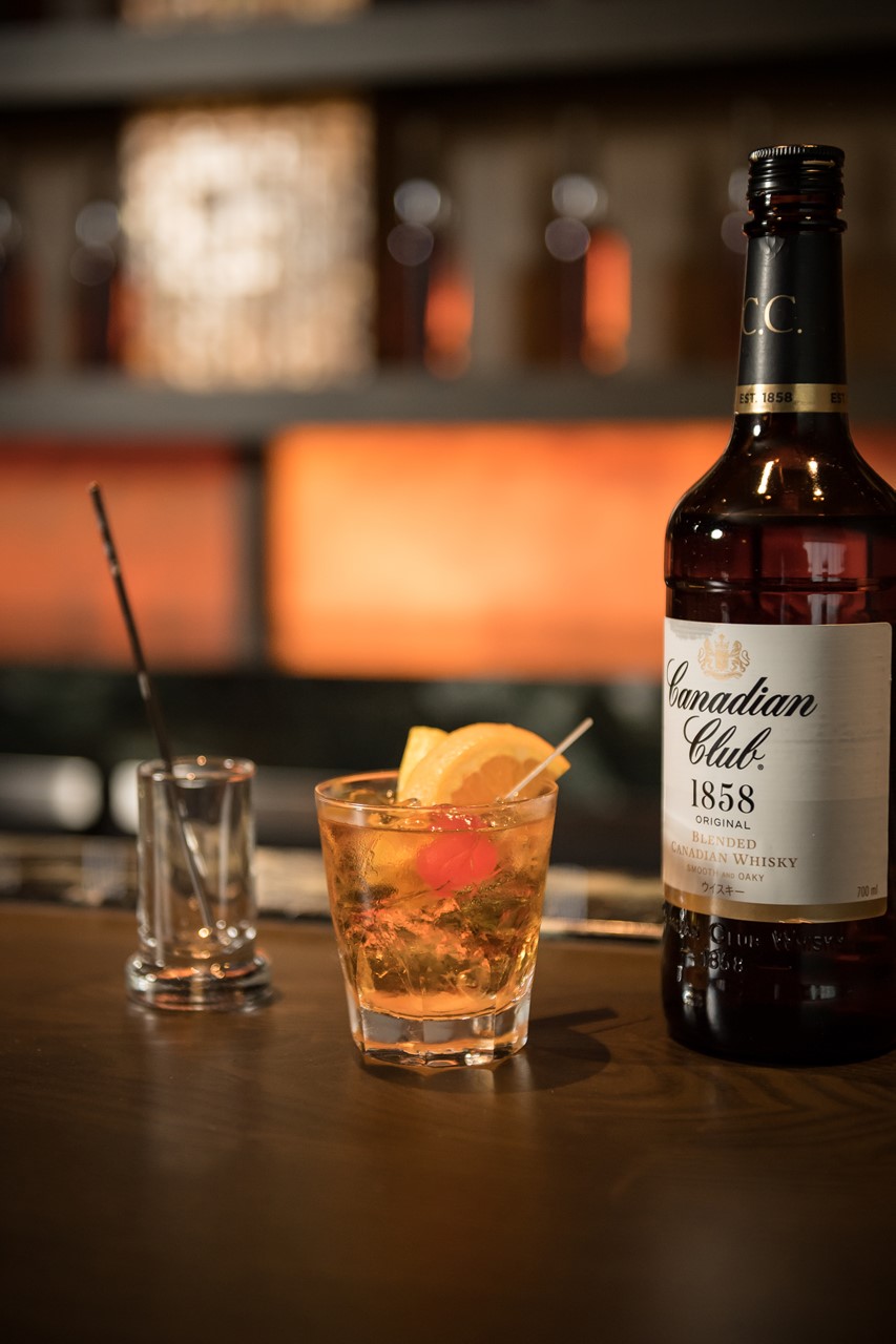 角砂糖にアンゴスチュラビターズを3、4滴染み込ませ、ソーダを少し垂らして潰す。細かく砕いた氷でグラスを満たしたらカナディアンクラブを注いで、スライスしたオレンジ、マラスキーノチェリーを乗せる。レモンの香りを振りかけて軽くステアしたら完成。