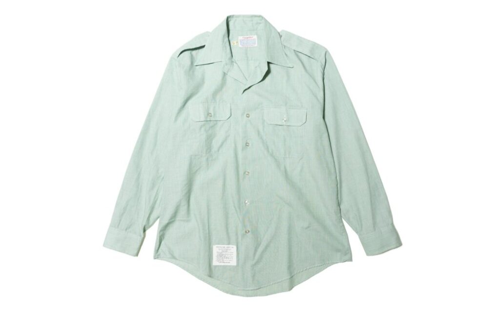 ロングポイントの襟が際立つUSアーミーのドレスシャツ。AG-415というアイスグリーンに近いカラーリングがおもしろい。コットンポリエステルの生地を使用。¥1900