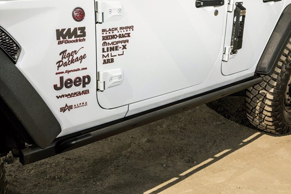 サイドステップは、クリアランス確保のためパイプ付きのロックレールを装着。