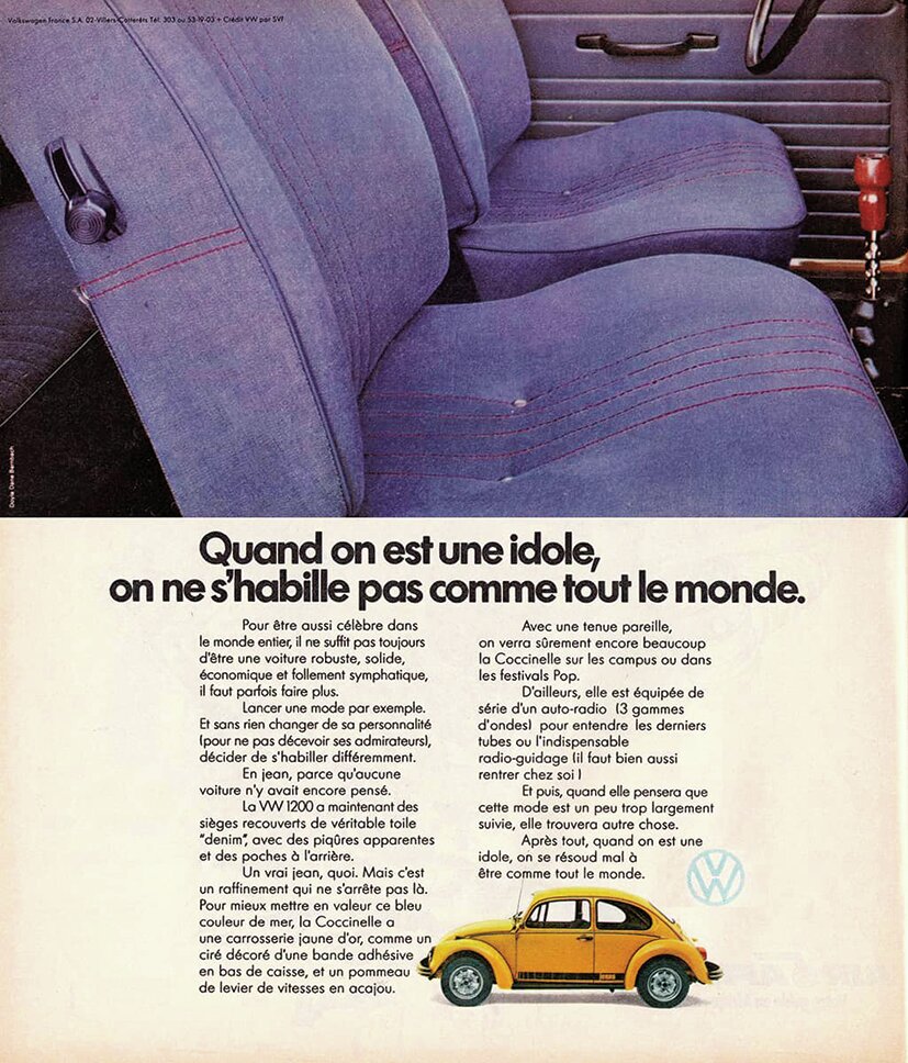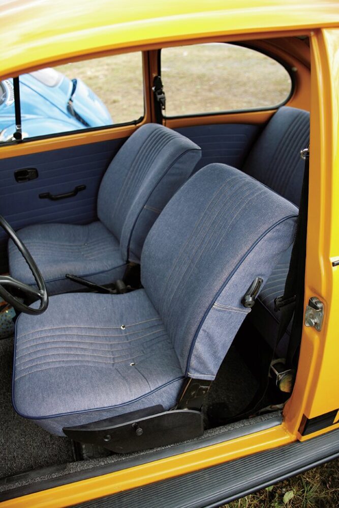 最初に登場したのは’74年式フォルクスワーゲンビートルの限定車として、内装にデニム生地を使用した、その名も「JEANS」。黄色いボディカラーのビートルに専用のサイドストライプステッカーやデニム生地のシートが備わるのが特徴だ。