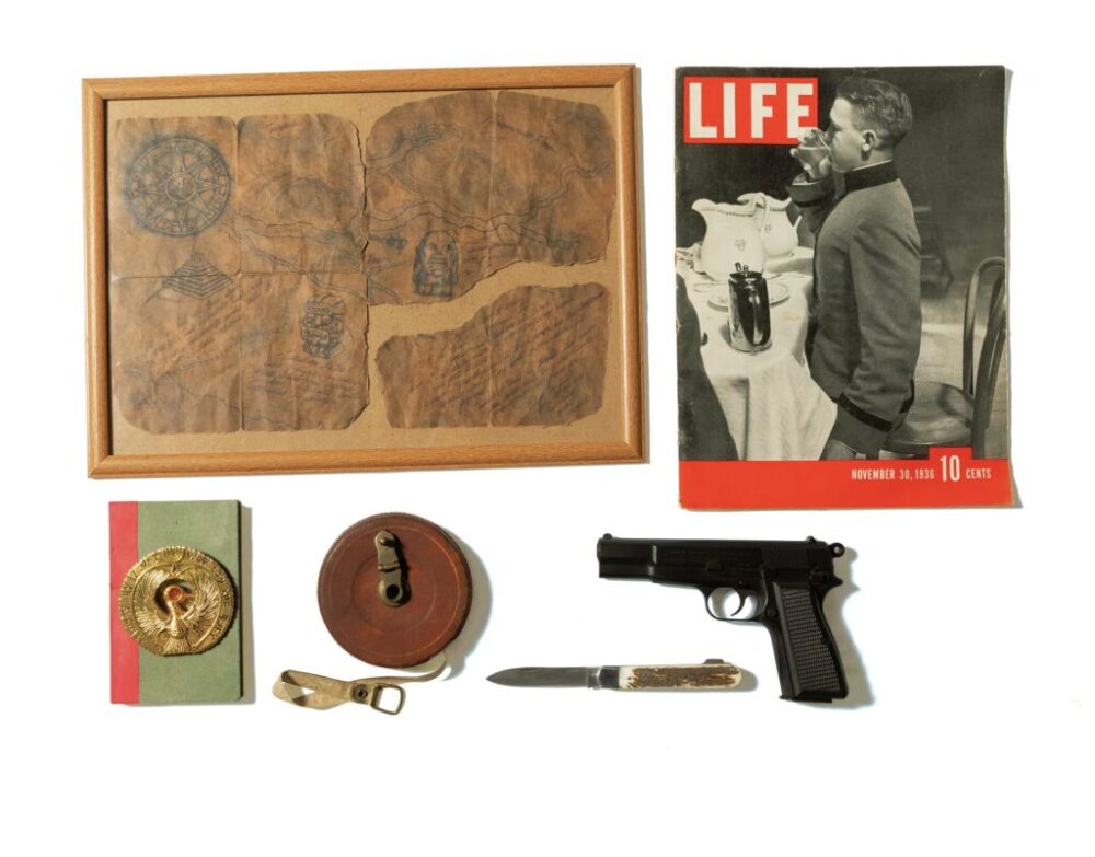 (左上)レイダースのガンバレルに登場するチャチャポヤン神殿への地図も精巧にDIY。(右上)機内でゲシュタポが読んでいた『LIFE』誌も、1936年11月号のオリジナルをしっかり確保。(左下)タニスの謎を解くべくゲシュタポとの熾烈な争奪戦を繰り広げたラーの杖飾り(メダリオン)は海外のファンメイド。同じく遺跡内での謎解きの際に使用していたノートは自作したもの。(中下)遺跡での発掘調査で使用されていたものとほぼ同年代のメジャーはeBayで落札したとか。(右下)サイドアームの「ブローニングM1935」とマリオンを助け出す際のナイフは、ともにほぼワンシーンでのみ採用された。