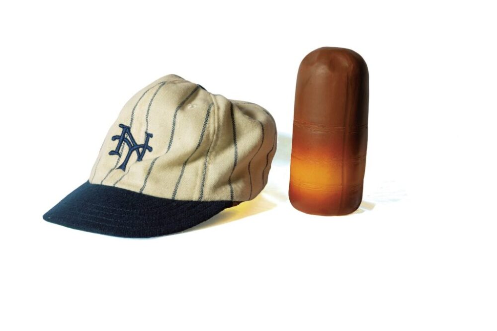 (左)小さな親友ショーティ愛用の当時のサンフランシスコジャイアンツのキャップは、クーパーズタウン社製レプリカ。(右)村の守り神でもあった本作のマクガフィン「サンカラストーン」のフィギュアも海外ファンメイド。