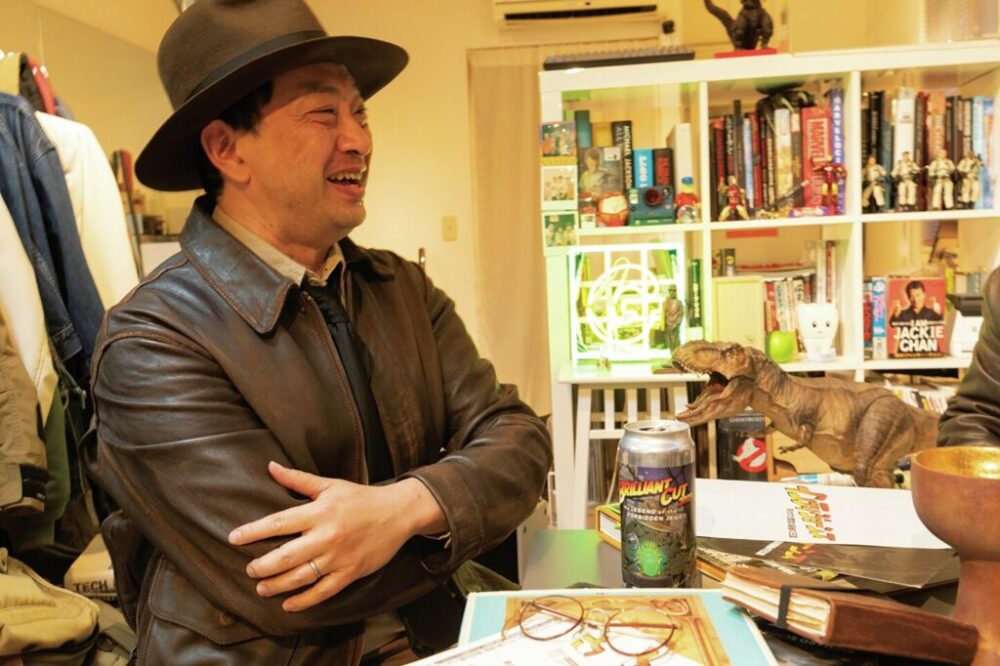 (左上)インディの父親ヘンリー・ジョーンズが着用したツイードハットはブランド非公表の推測品。(中上)本作のヒロイン、エルザが着用していたナチス兵の将校用キャップも精巧なレプリカを所有。(右上)ラストシーンで数ある聖杯から選び出した通称〈大工の聖杯〉はグラフィックデザイナーのインディファン、猫印さんがDIYした木製モック。(左下)気づきづらいが、じつはエルザから借りパクしていたジッポは、マックスケイディ社製レプリカ。(下左から2番目)双眼鏡もブランド非公表。国内の老舗眼鏡店からネットフリマを通して入手したという推測品。(下右から2番目)父親から引き続いた聖杯日誌。(右下)若き日のインディがギャングから奪還した「コロナドの十字架」。フィリピンのファンメイド品。
