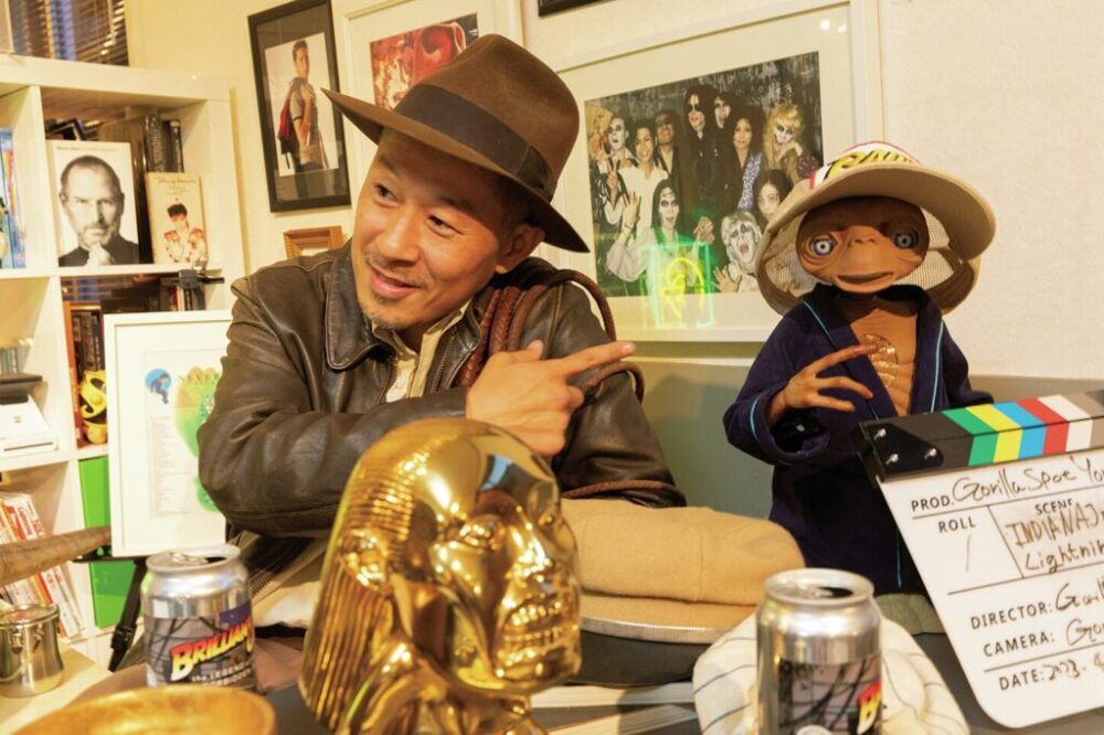 マットコスでハーレーに跨がるインディファンのゴリラさんは普段は創作所『Gorilla Spot』のオーナー。ラペルに並ぶピンズなども一時停止を駆使し、全て当時もので揃えたというこだわりよう。