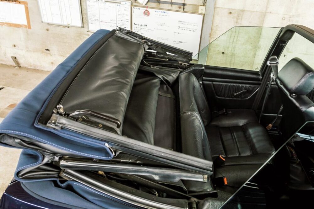 数年前に全塗装をし、ホイールも磨き直されているほか、フロントシート二脚も純正同様のレザー素材で張り替え済で新車のような輝きを放っている。前オーナーもスピニングガレージで長年整備をしてきたため、調子も抜群。現代の路上でも当時と同じく楽しくドライブが楽しめるカブリオだ。