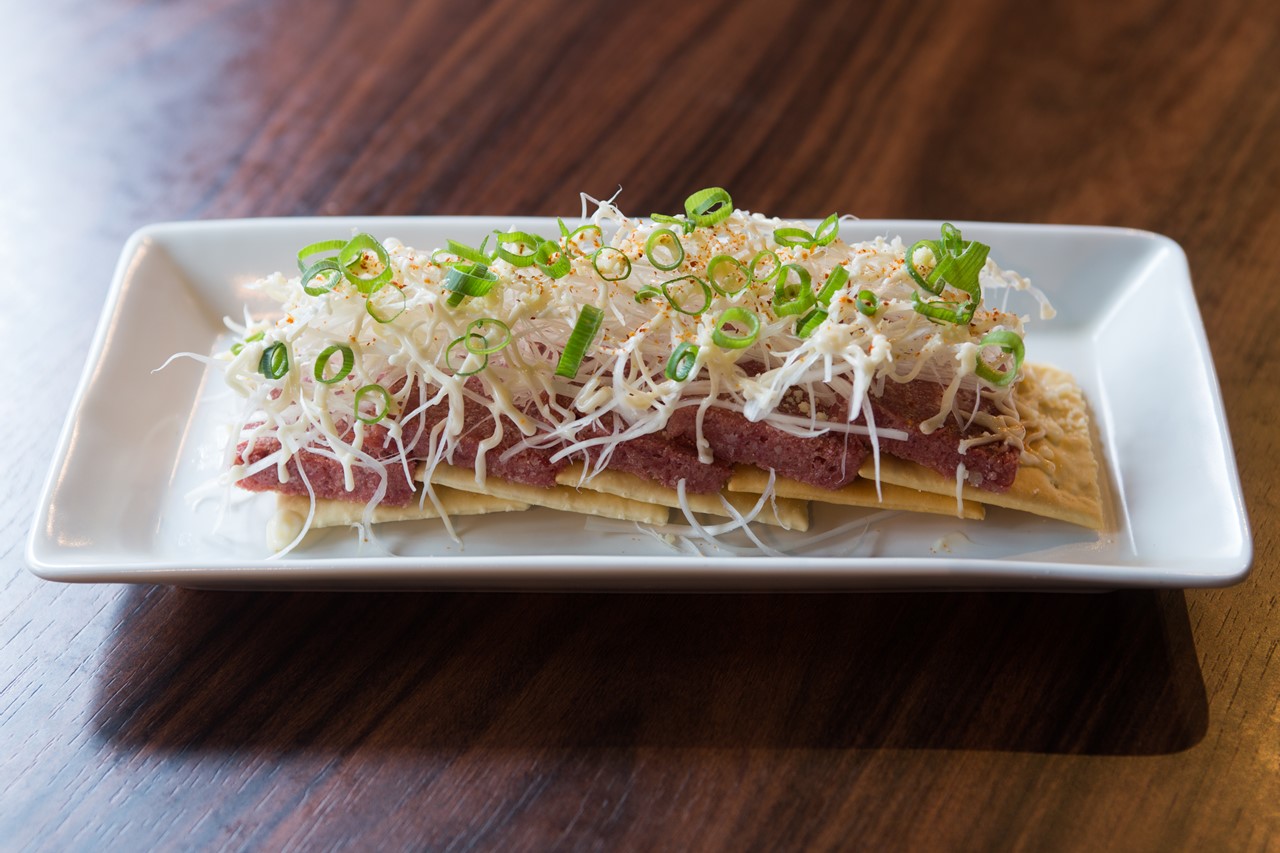 コーンビーフとマヨネーズ、ネギ、チーズの懐かしい味を楽しめる「コマネチ」。