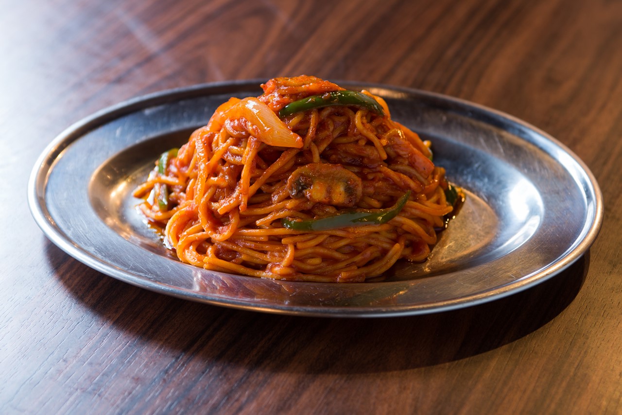 人気No.1のナポリタン。2mmの太麺でモチモチした食感が魅力。マーガリンをたっぷり使い、酸味が少なく甘めの仕上がり。