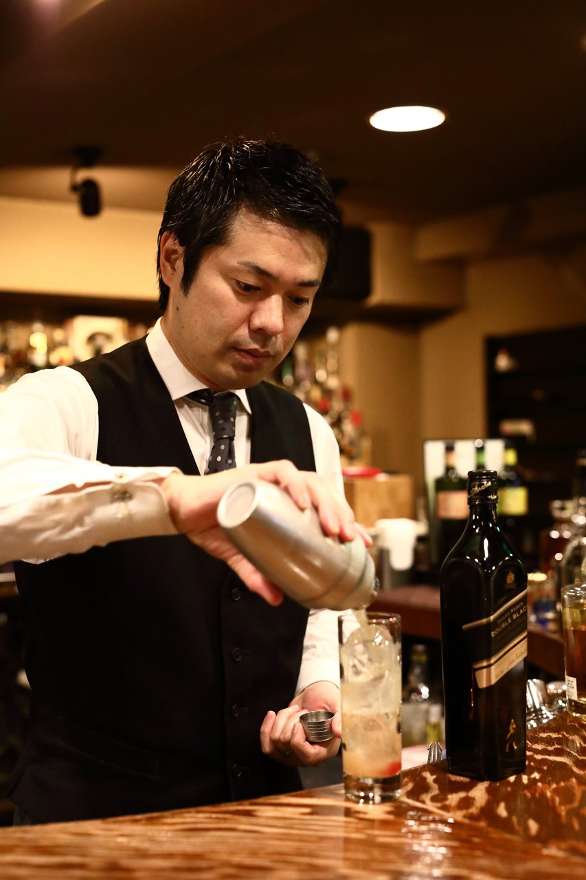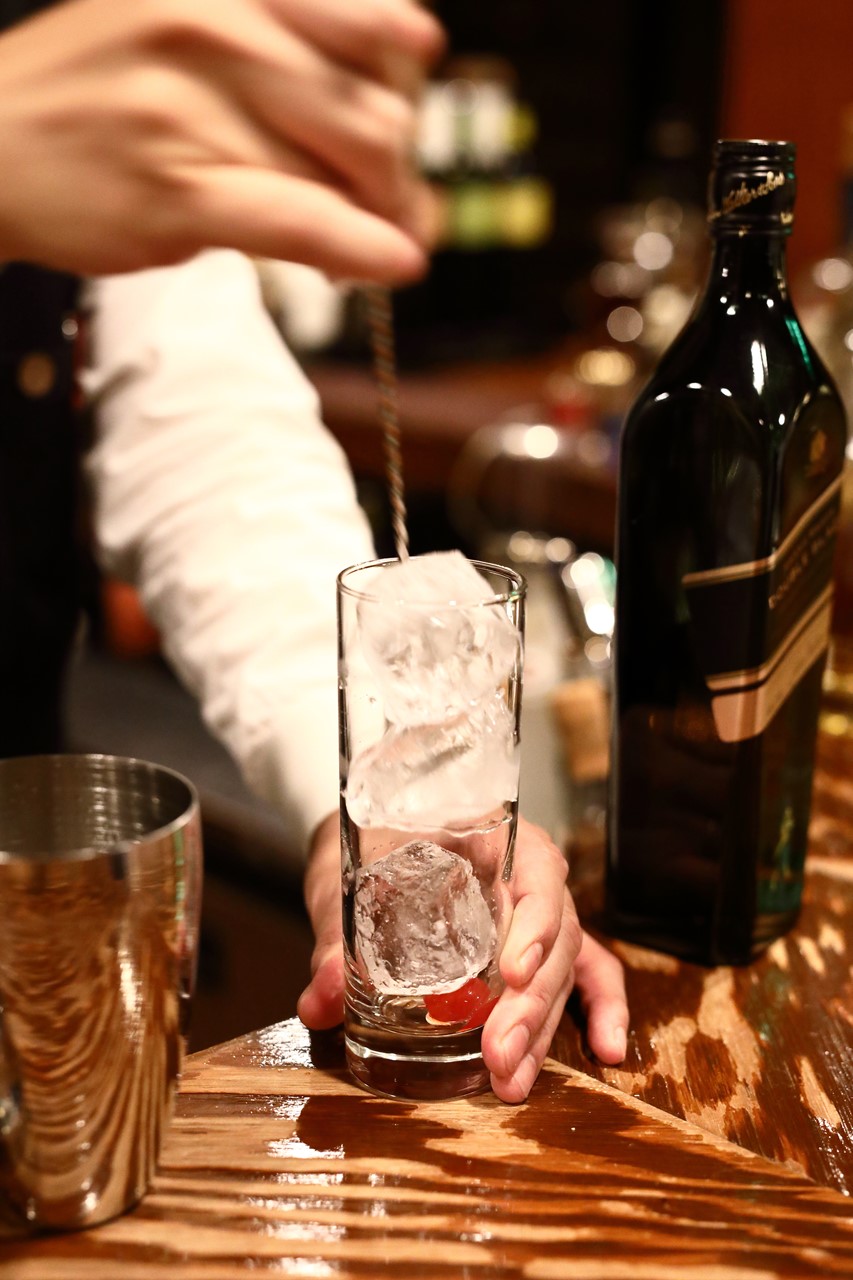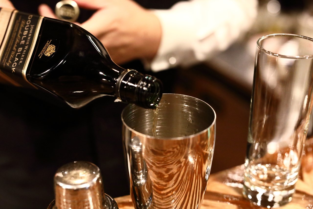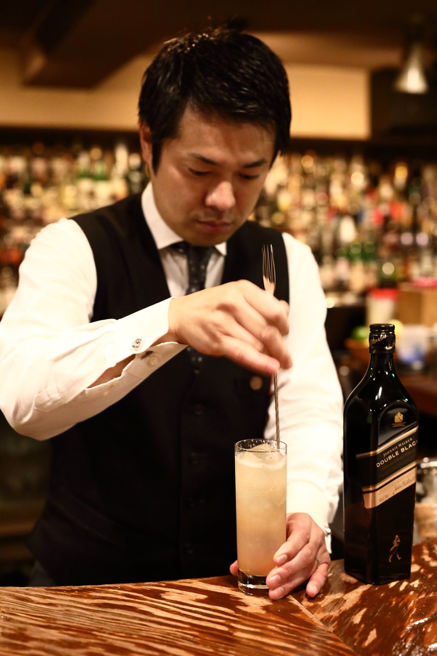 シェイカーにブレンデッドウイスキーのジョニーウォーカー30mℓを注ぎ、氷を入れシェイク。“ジョニ黒“のニックネームで知られるブラックよりさらに香りが強いダブルブラックをチョイス。