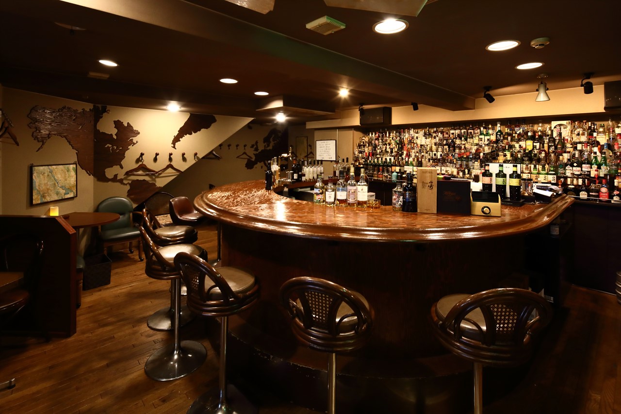 エントランスを潜ってまず目に入るのはU字型のカウンターの奥に並べられた数百種類のウイスキーをはじめとしたボトルの数々。決して敷居が高そうに感じる雰囲気ではないが、ウイスキーのラインナップは本格派。定番からレアモノまで世界各国から厳選したウイスキーを取り揃えている。