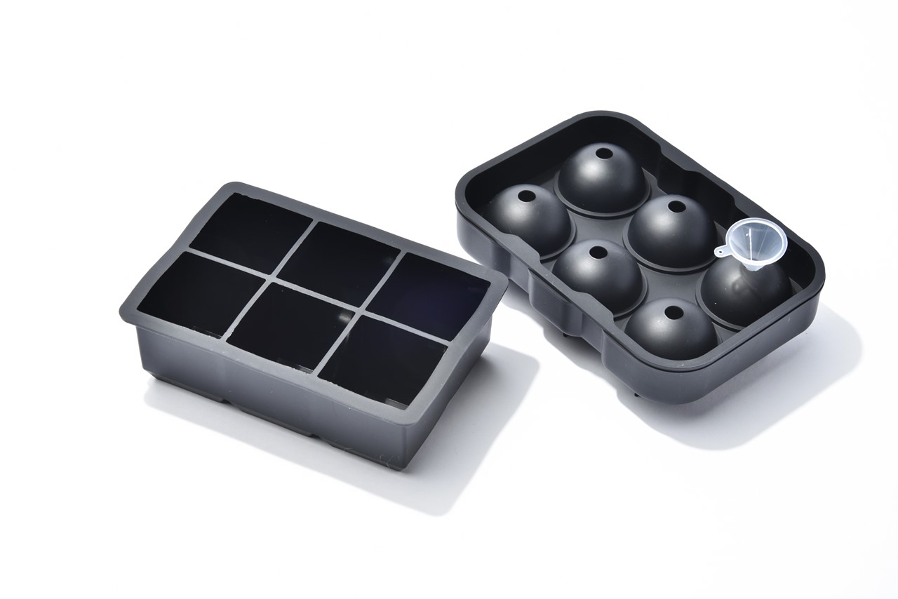 丸い氷、四角い氷、どちらの形の氷も作ることができる製氷皿セット。シリコンなので取り出しやすく、氷のサイズも大きめなので、ロックに最適。洗浄も簡単で食器洗い機を使っても変色することはない。ボール型を作るときは付属のロートから水を入れることができる。