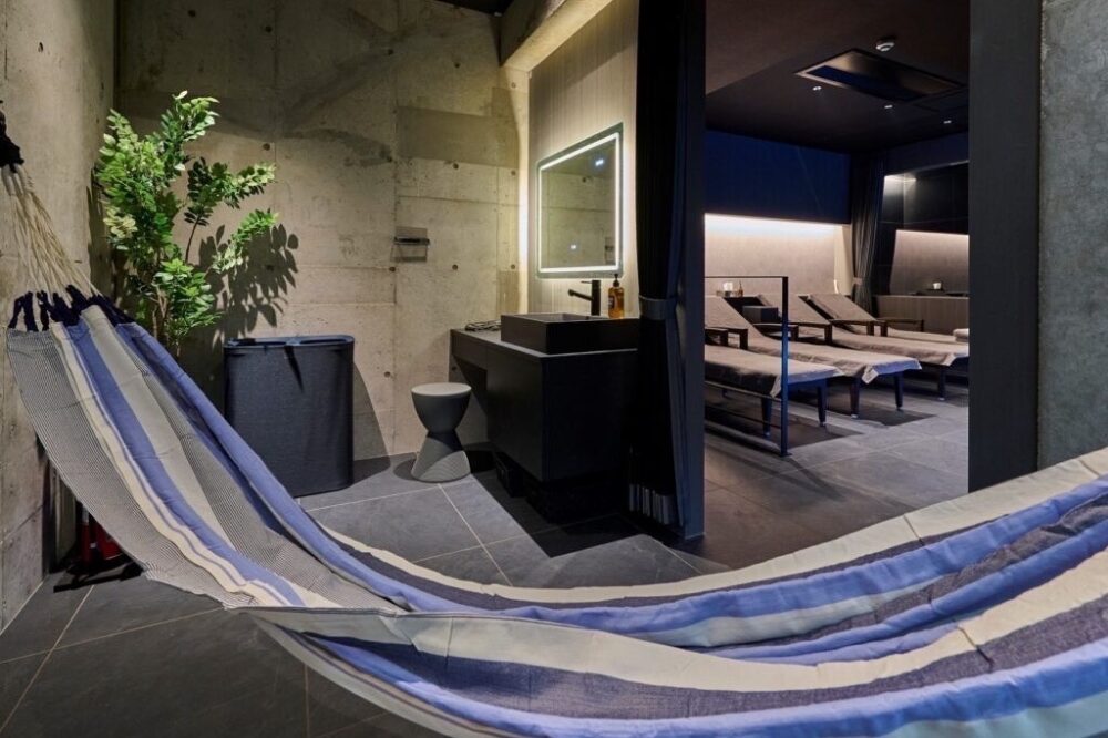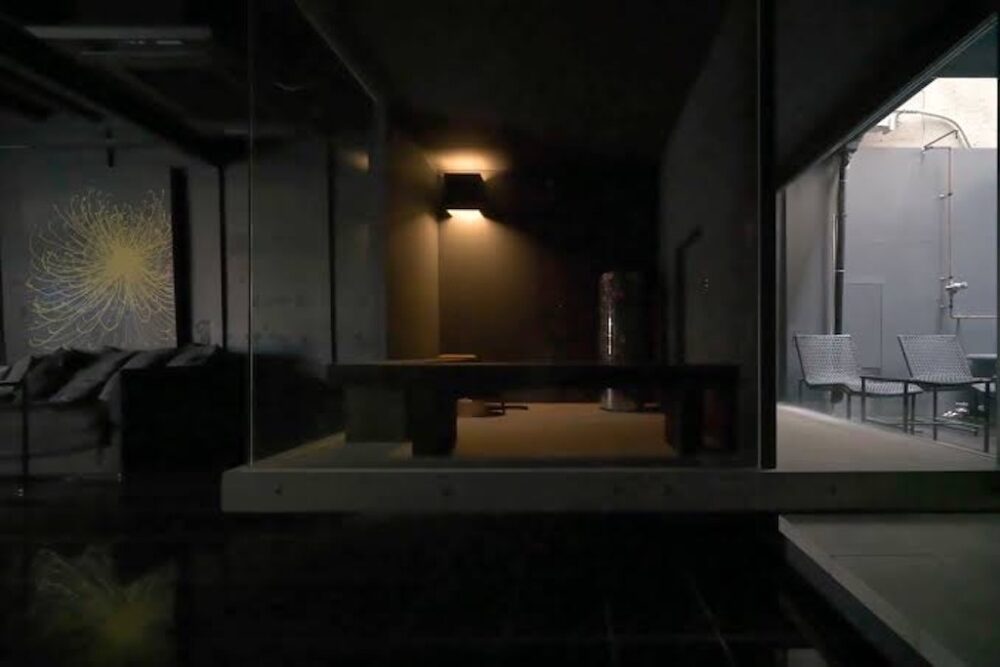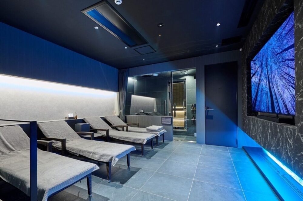 このお店のプロデューサーS氏にご招待いただき、プレオープン時にひと足先に体験させてもらったのですが、ロウリュウ(サウナストーンに水をかけ、湯気や蒸気を立ち昇らせること)ができるガラス張りのサウナ、15度に冷却した信楽焼きの水風呂、坪庭での外気浴、御影石張りのリビングでの食事、2階では墨色のベッドルームにて宿泊も可能です。