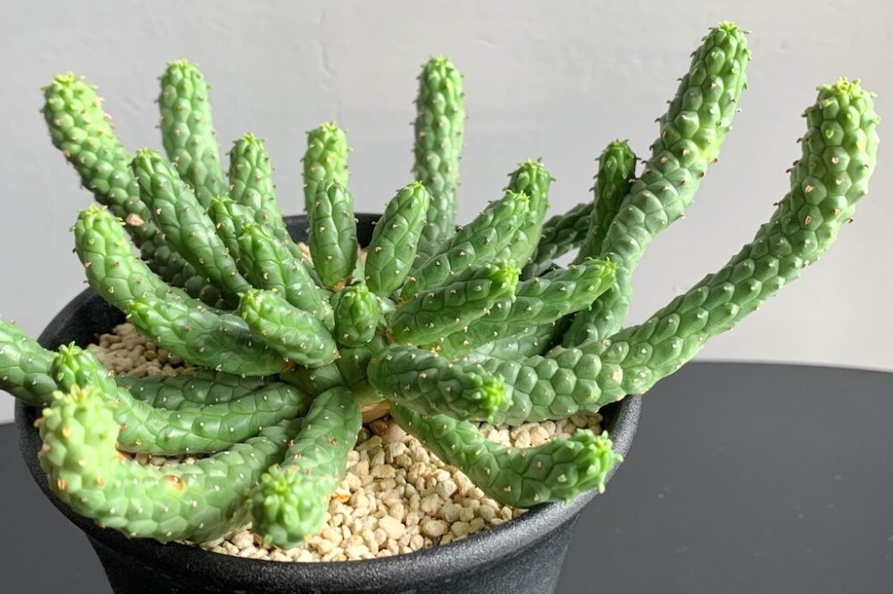 タコモノ系ユーフォルビアの中でも人気が高い品種であるユーフォルビア・デセプタ。「緑鬼玉」という和名にふさわしく、美しい緑色の肌とそこから無数に伸びる枝が特徴です。