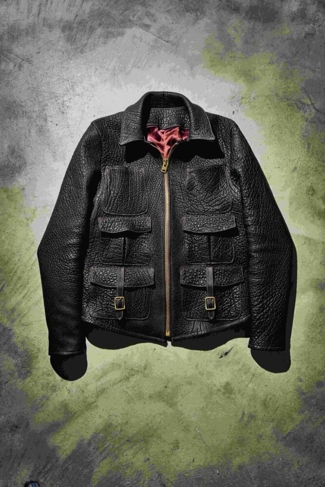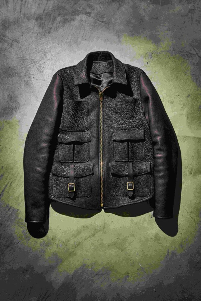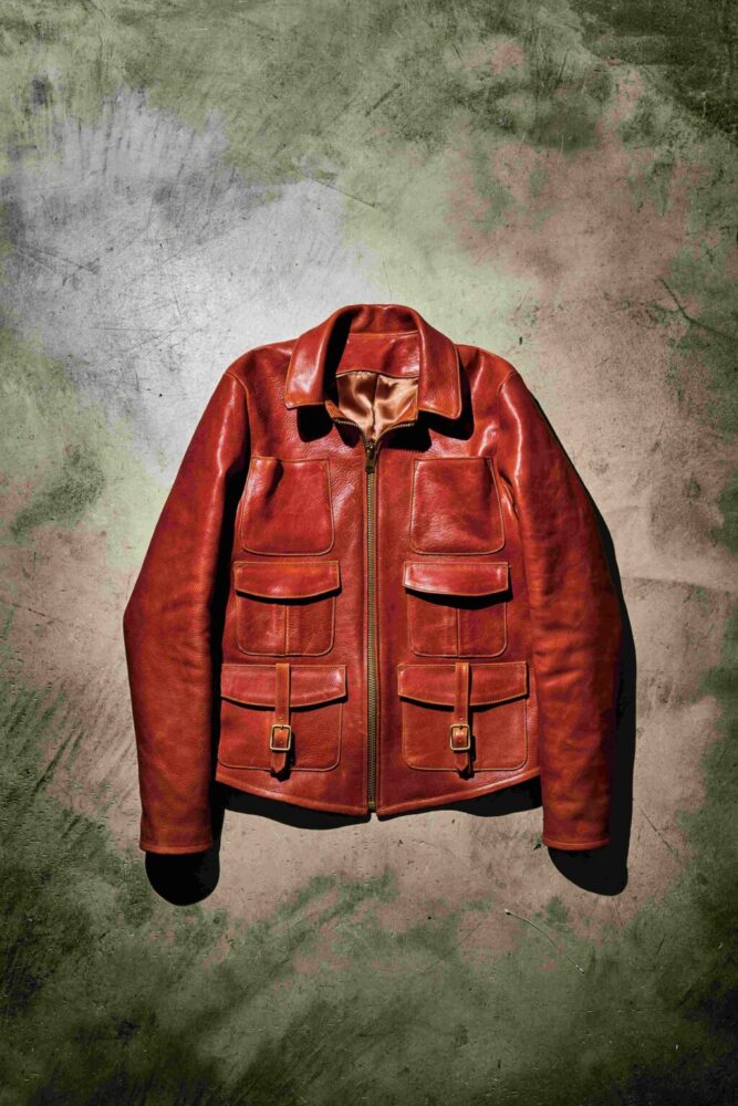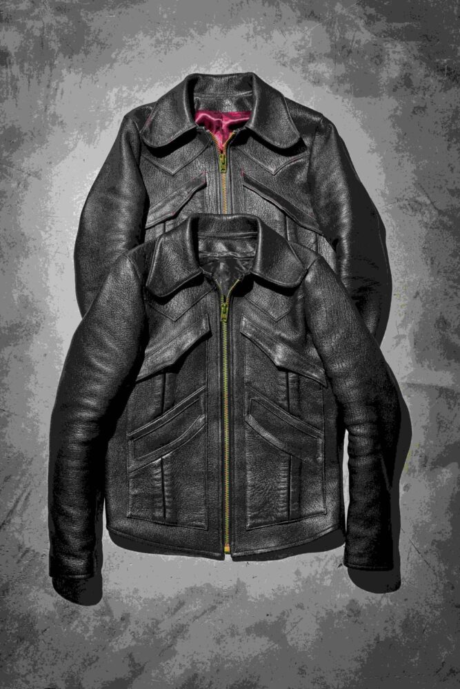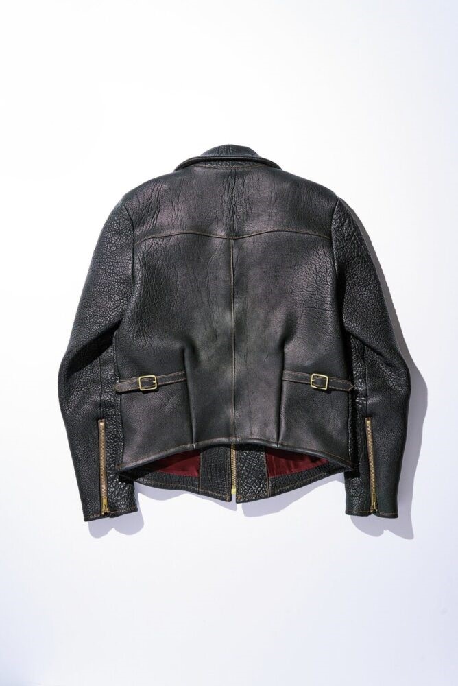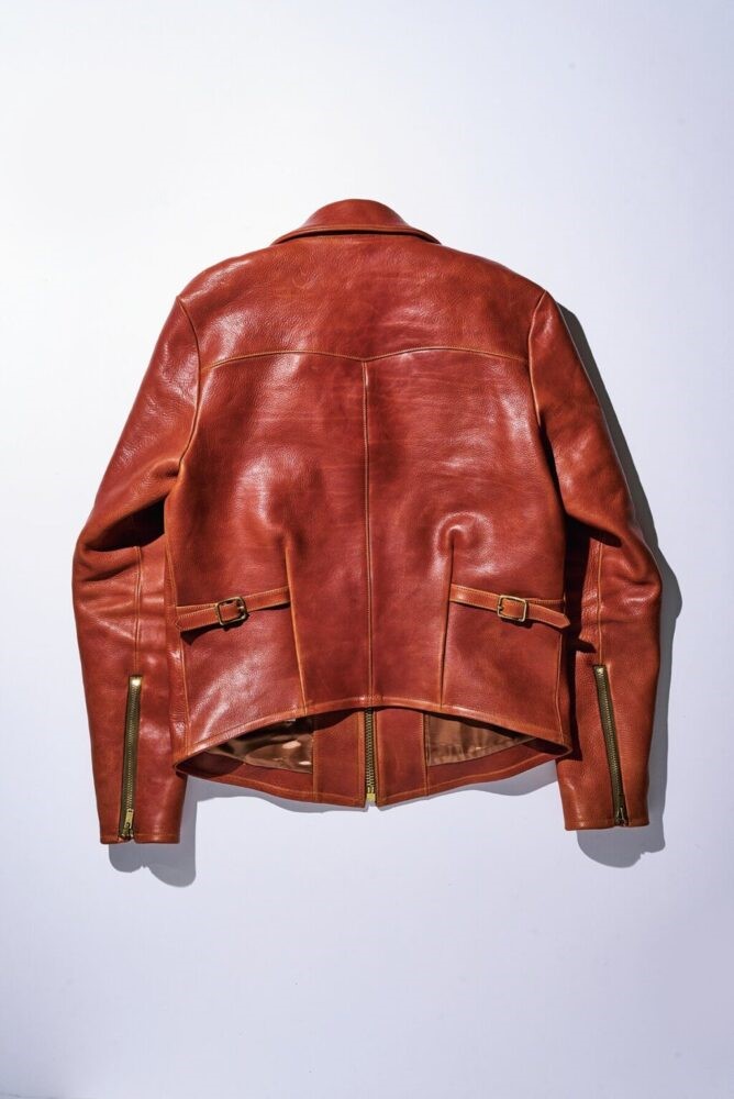 前頁のカラー違いのモデルで、こちらは赤みがかったブラック仕様。シボ感の強い渋鞣しのバッファローハイドを一頭使いしており、革の背骨部分がジャケットの背中心に来るよう配されている。オリジナルの持つタイトシルエットはそのままに、通常体型の人でもスムースに着られるよう、パターンが改良されている。22万9900円
