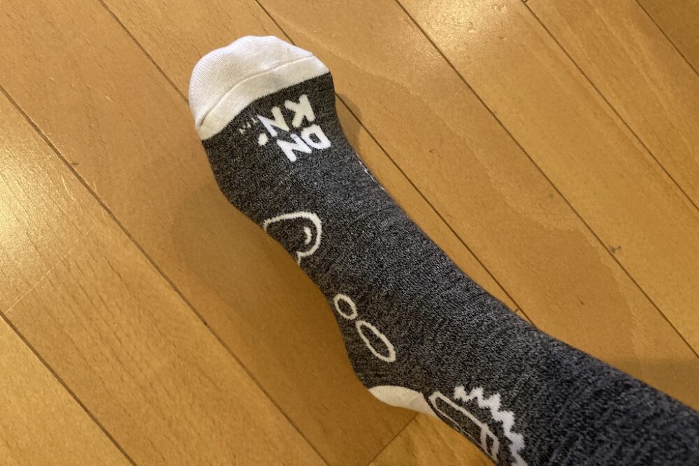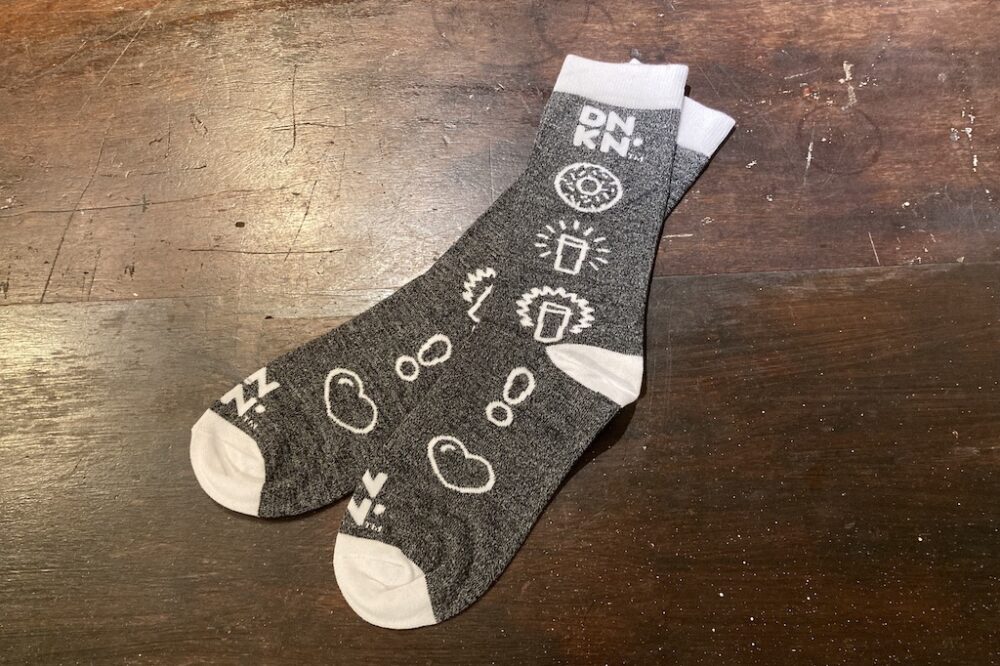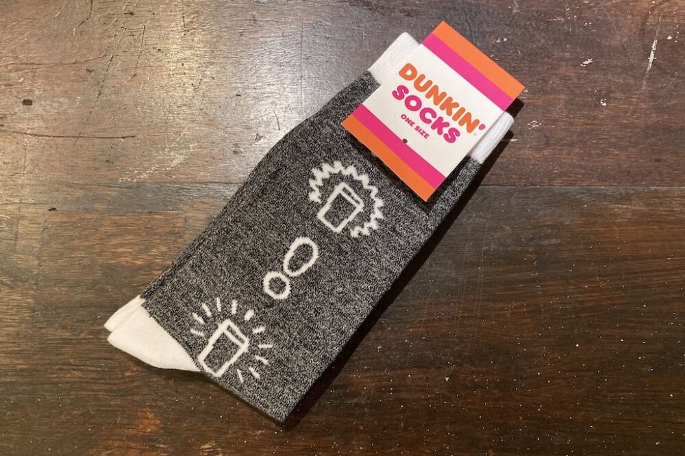 そんなダンキンドーナツも、最近ではドーナツ以外の展開もしているようで、今回見つけたのはなんとソックス。これは現在でもアメリカの一部の店舗で発売しているオリジナルグッズのひとつで、そのノリは日本で言うところのコンビニのオリジナルソックスみたいな存在。
