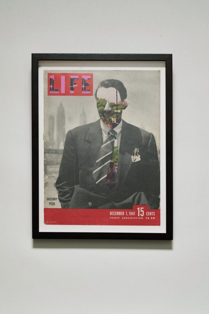 仕事柄、資料として1940~’60年代のアメリカの雑誌(LIFE、Esquire、National Geographic、The Saturday Evening Postなど)を収集していたため、素材は手元にたくさんあった。保管場所の関係もあり、そろそろ一部を処分しなければと思っていた矢先、コロナウィルスによるパンデミックで自宅時間が急増。処分する予定だったそれらを使い、コラージュアートを始めることにした。