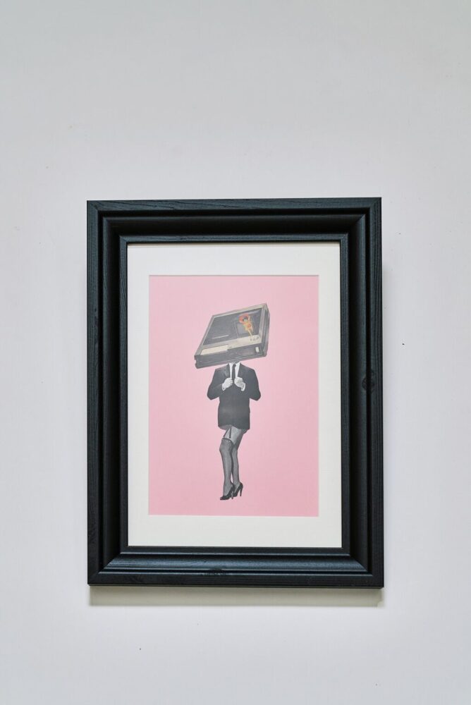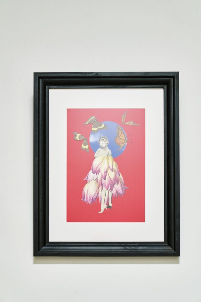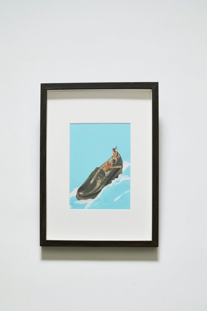 作品サイズは、額に合わせて5~6サイズを最初から用意し、それに合わせてマットを用意。ヴィンテージ雑誌を1ページずつめくりながら、ベースになる素材を決め、全体のテーマやイメージを連想しながらコラージュする素材を探していく。その途方もない作業から幾多の作品が生まれるのだ。手掛けた作品の名は、完成後に考えるそう。
