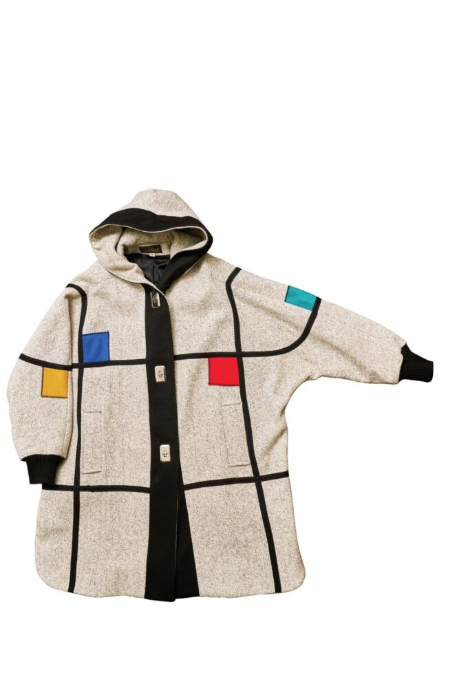 最近ローズボウルのフリーマーケットで見つけた古着のコート。モンドリアンパターンが目を引く上質な作りの1着だ。