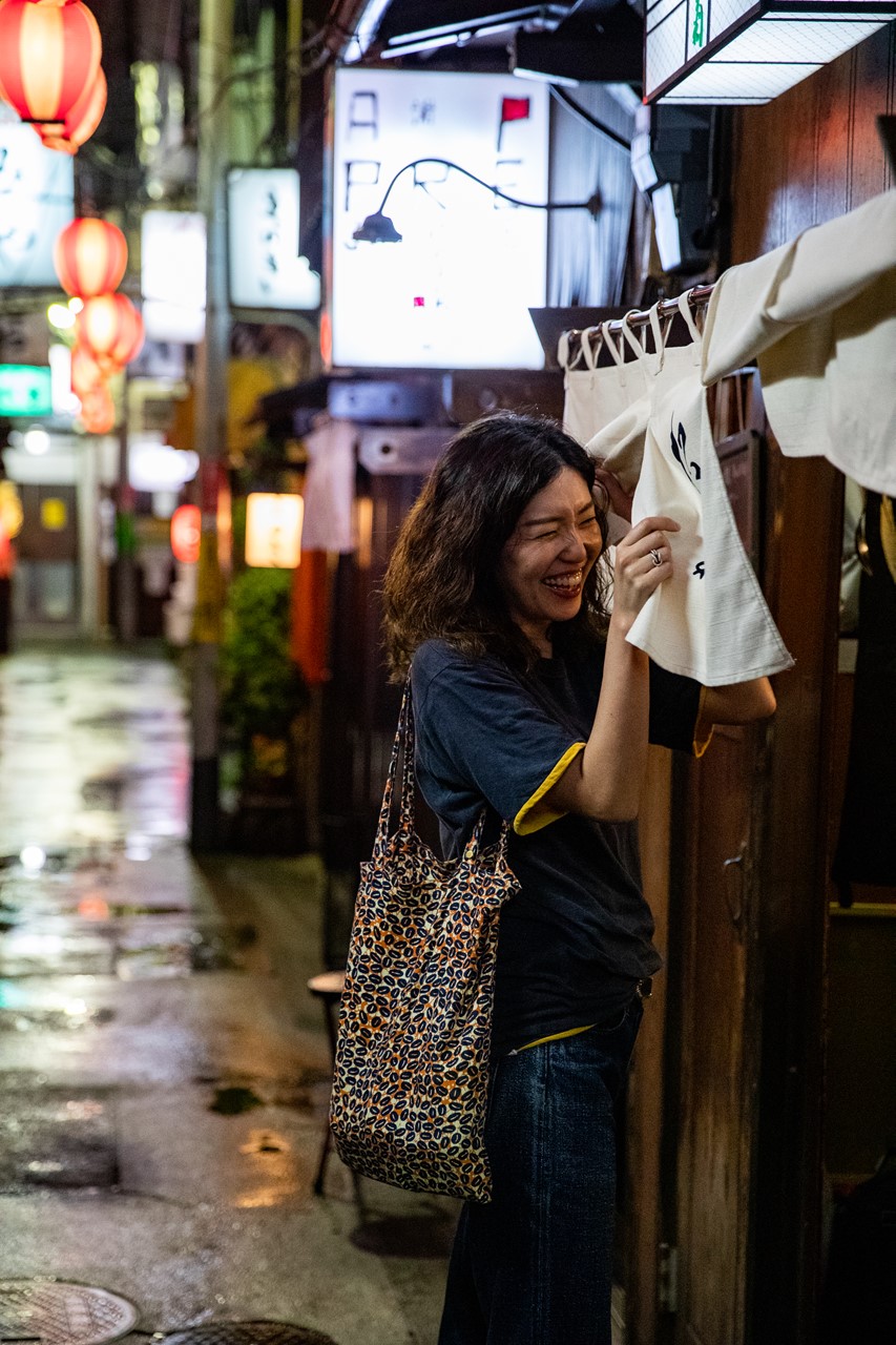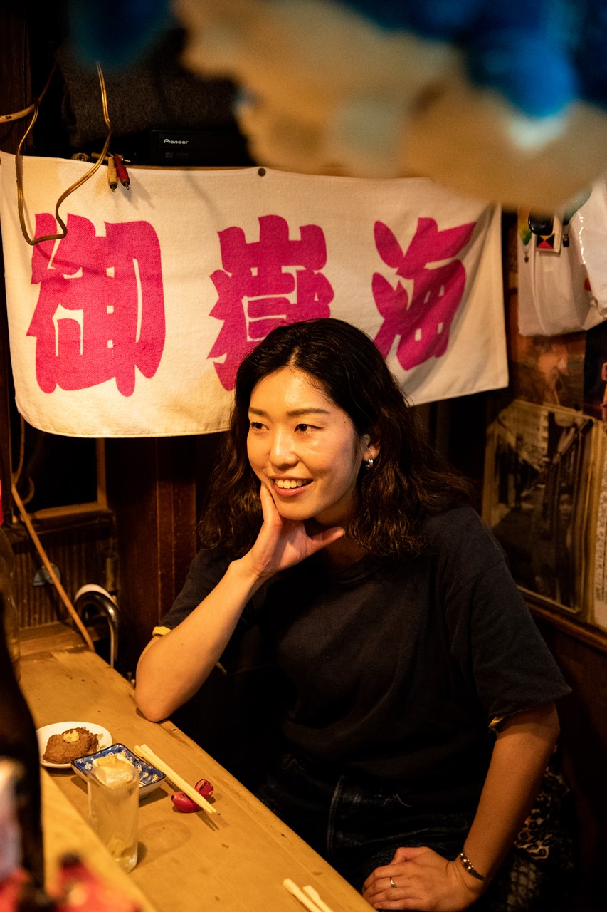 1店舗平均2坪ほどの広さで定員は10名ほどの小さな居酒屋がズラリと並ぶ。そんな渋谷のディープな横丁で美味い酒に舌鼓を打つのは、ピュアブルージャパンのプレス兼ショップマネージャーである田村梢さんだ。