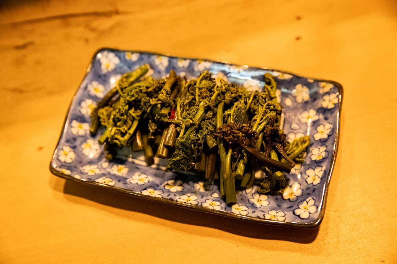 会津の名門酒蔵である榮川酒造の「榮川」のにごり缶(180mℓ)700円。都内でも限られた店でしか味わうことができない銘酒。またほどよい塩加減がクセになる山ウド、ワラビのたまり漬けは各500円。ニシンの山椒漬け600円。イサキのカマの煮付けは当日の限定メニュー。イナゴの佃煮は要望に応じて。
