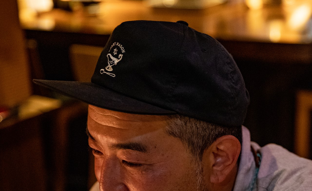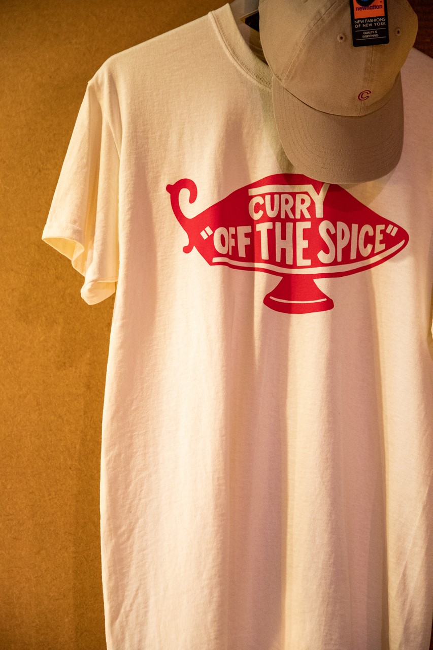 カレー好きが高じてCURRYMASON(カレー・メイソン)という名のブランドも立ち上げた角川さん。カレー・メイソンのロゴキャップやTシャツなどもショップで少量販売されている。