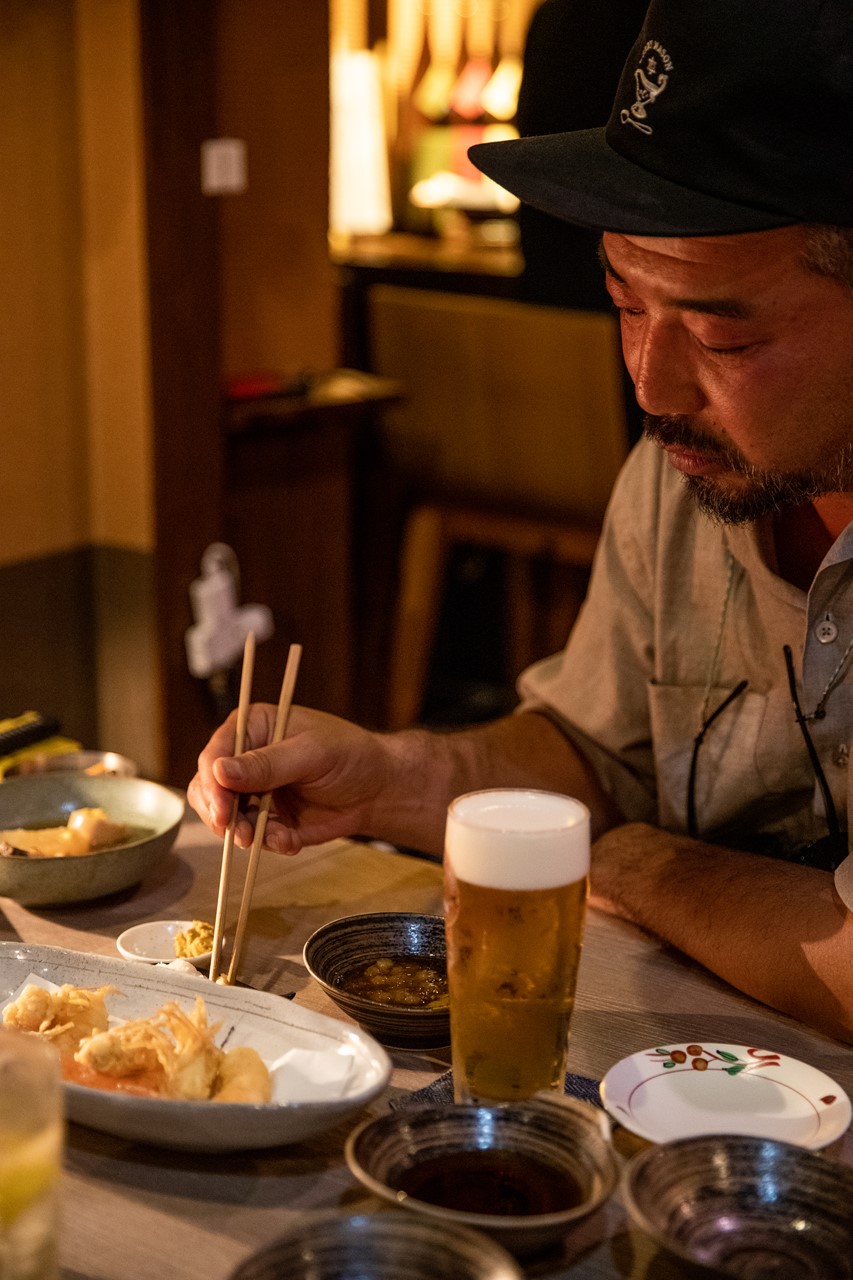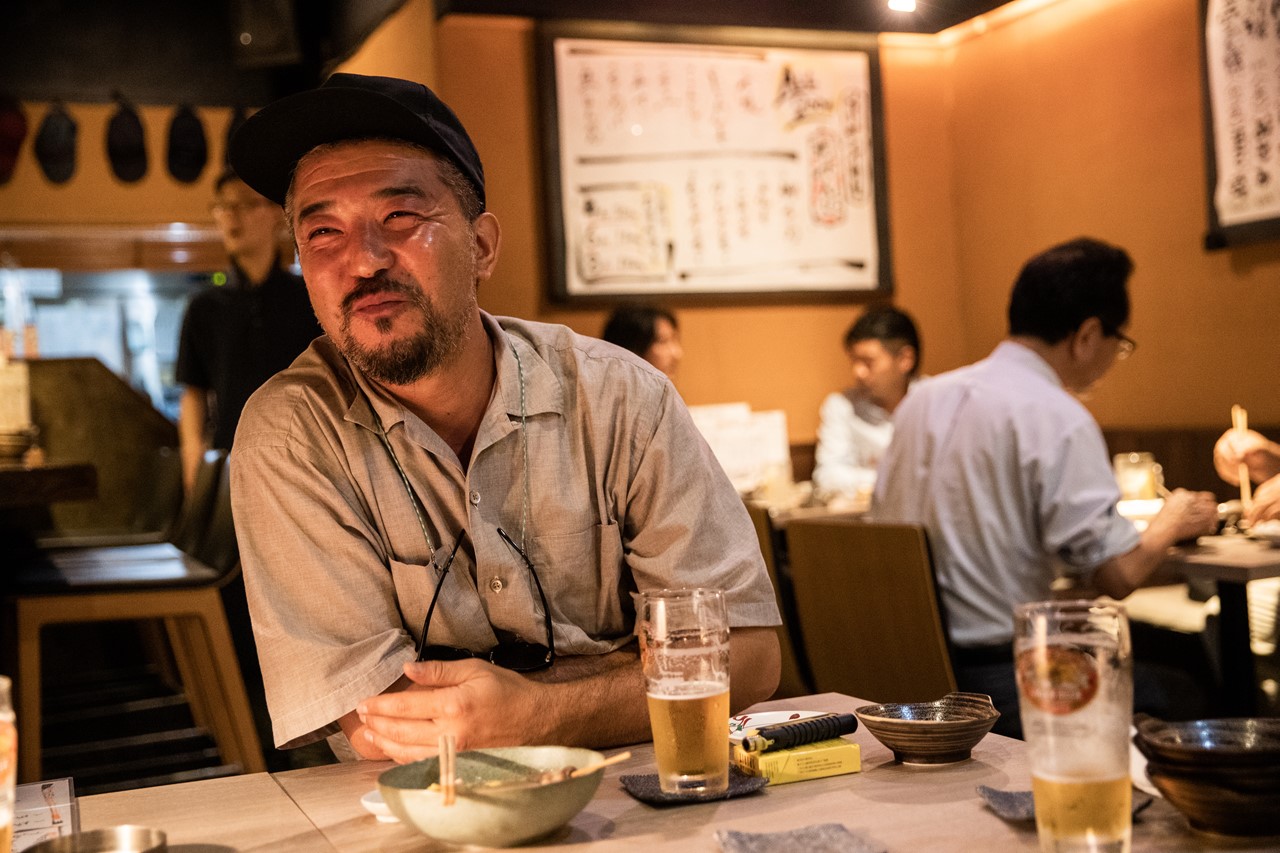 まずは生ビールで喉の渇きを癒す角川さん。地元であるため、気まずい空気もなく、周囲を気にせず飲める気楽な酒が1番好き。「カドナシヤ」は友人がオーナーを務める赤羽の人気店。名物横丁である「一番街」の「FUJICO」も系列店だ。