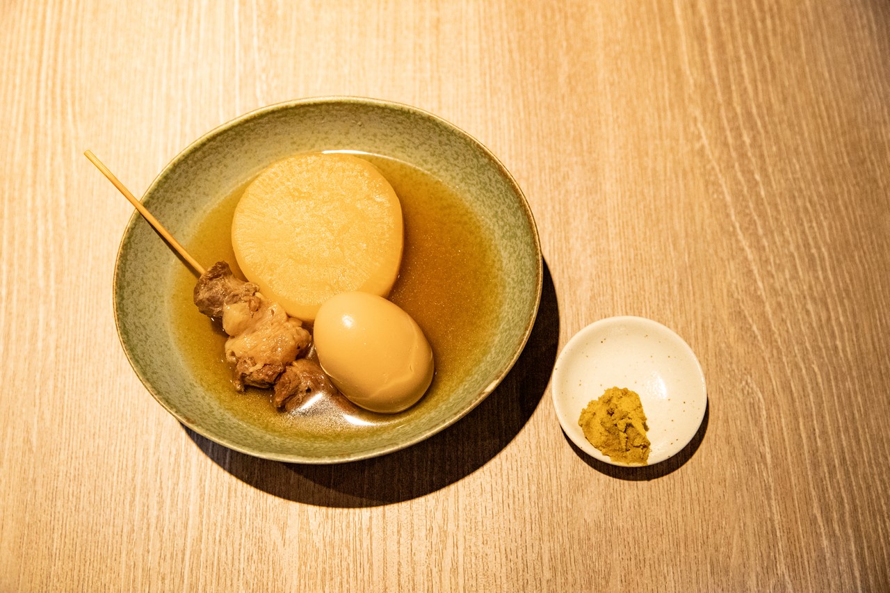 出汁が充分に染み込んだ おでんは「カドナシヤ」名物。透き通るような大根と、いかにも味が染みまくっている玉子、そして牛すじ串は角川さんの定番。各200円