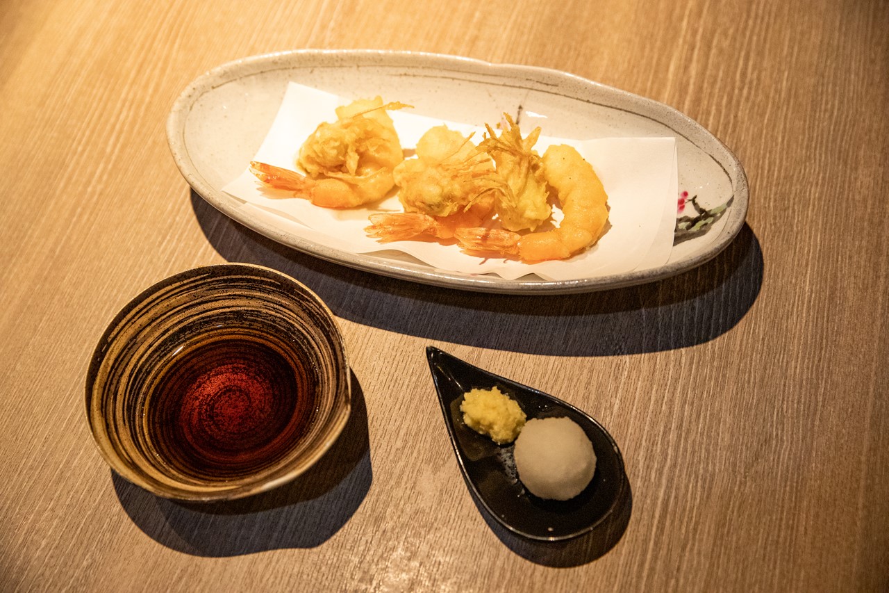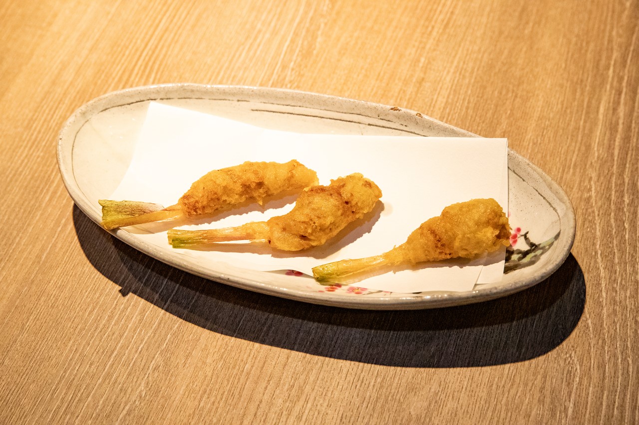 焼き鳥専門店のようにひと品ずつ頼めるスタイルがお気に入りの天ぷらメニュー。谷中しょうがの天ぷらは爽やかな味と歯ごたえが堪らない。380円