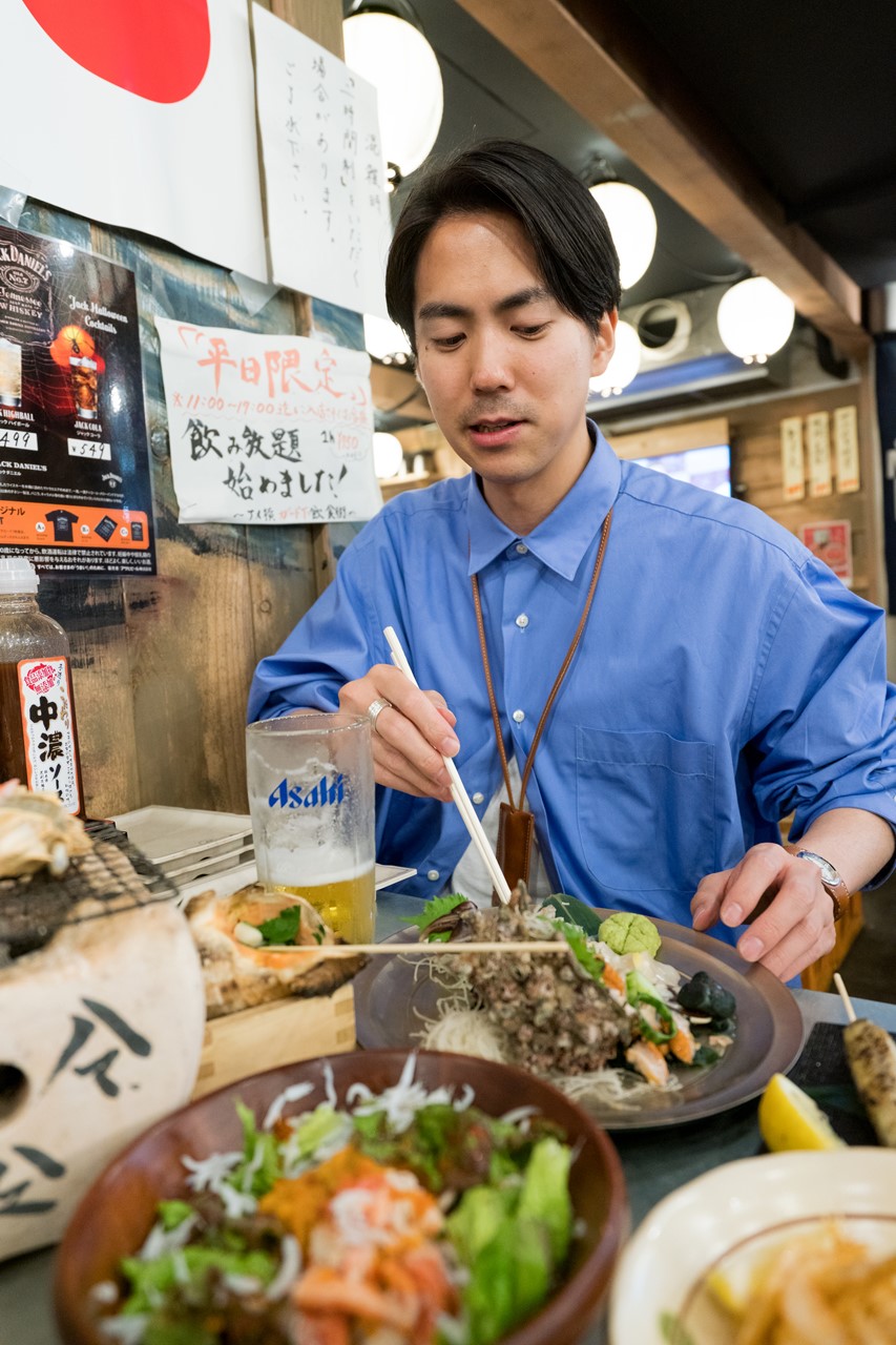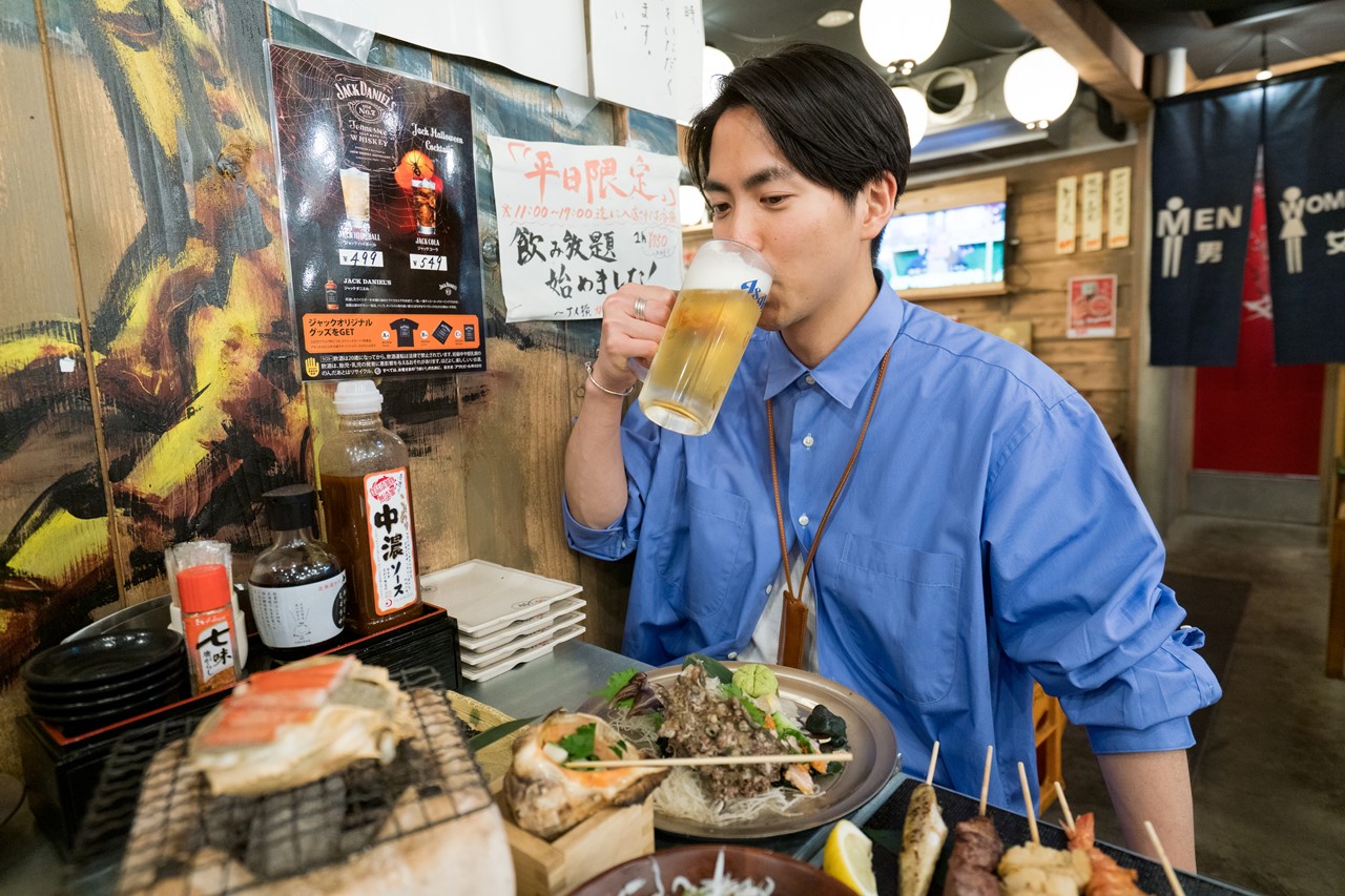 「どれも美味い! 最高ですね。ビールが進みます」と喉を鳴らす川辺さんは今年で34歳。若い人たちは昔に比べて酒を飲まなくなったと言われるが、川辺さんは酒の場が大好きなのだという。