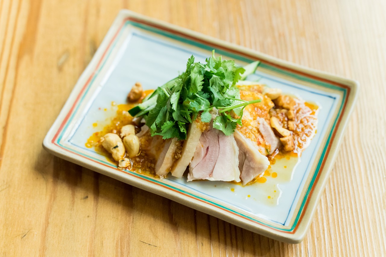 名物の「よだれ鶏」(799円)。甘辛いソースがかかっており、酒のアテにちょうどいい。都久志屋で は一流の味を気軽に楽しんでもらうことをモットーに、素材を厳選し、調理方法も工夫している。