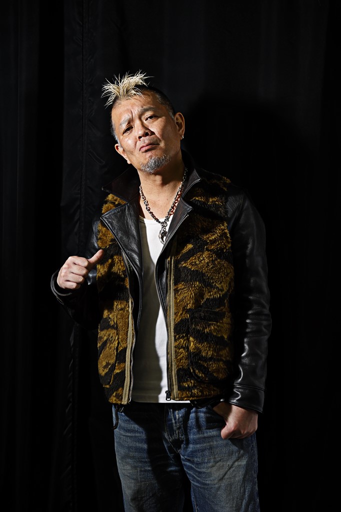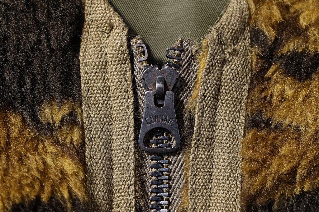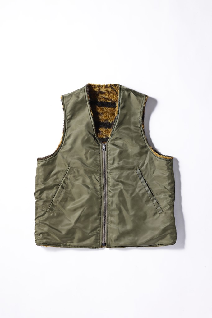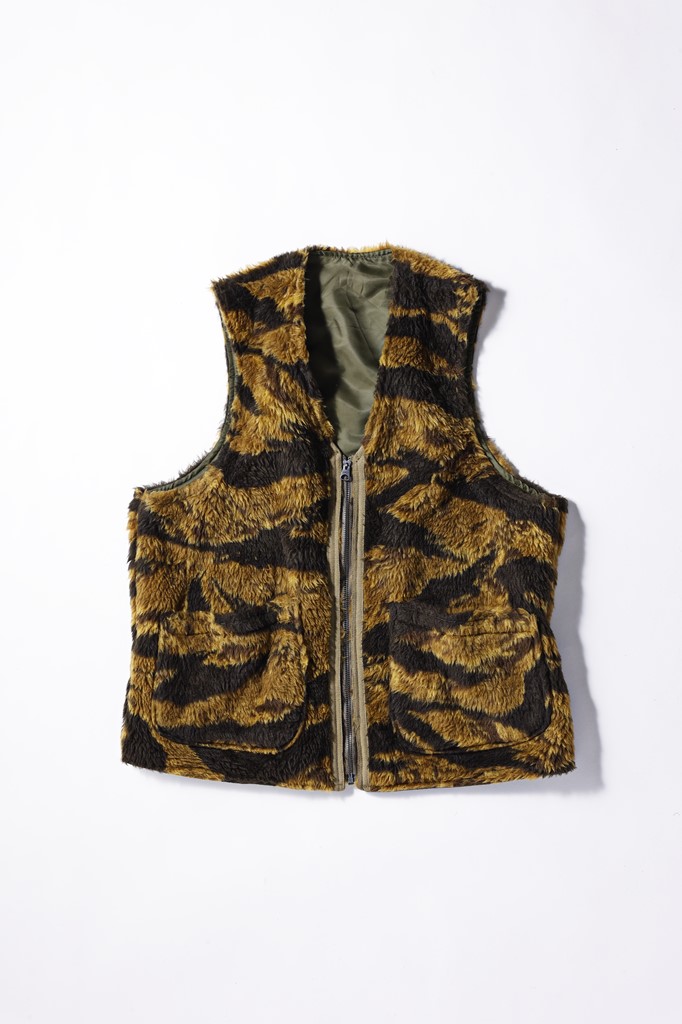 新宿の風に吹かれ、ビールも入り、気の大きくなった俺は、イベントの合間にこのベストを衝動買いしてしまった。タイガーカモ柄のボアベストで、革ジャンの上に羽織ると、即席の熊ジャン(虎ジャンか?)に早変わりする便利アイテム。シルエットはバイカーベスト風で、肩部分が細いのも俺好み。リバーシブル仕様なのも嬉しいポイントよね。例えば昼間の新宿を歩く時はナイロン面を表にし、夜の帳が下りる頃、静かにタイガーに変えて、魍魎たちが蠢く夜の歌舞伎町というジャングルへと静かに消えていく……表と裏、昼と夜、2つの顔を持つ新宿にぴったりのベストだと思わない?