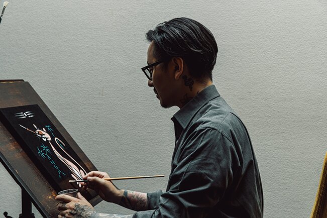 現在、グラッドハンドのディレクターを務めるL.さんは、幼少期から絵を描くことが大好きで、独学で美術を学んだ。それと同時にアメリカのホットロッドやタトゥーなどのカウンターカルチャーに触れ、大きな影響を受けた。そんなL.さんが感銘を受ける作品は、名もなきアーティストが残したストリート的なものだと語る。